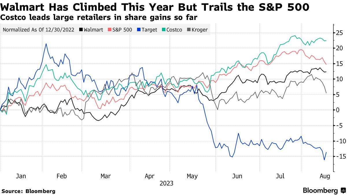 纽约时间上午10:21,沃尔玛股价下跌不到1%。截至周三,股价上涨了12%,而标普500指数上涨了15%。