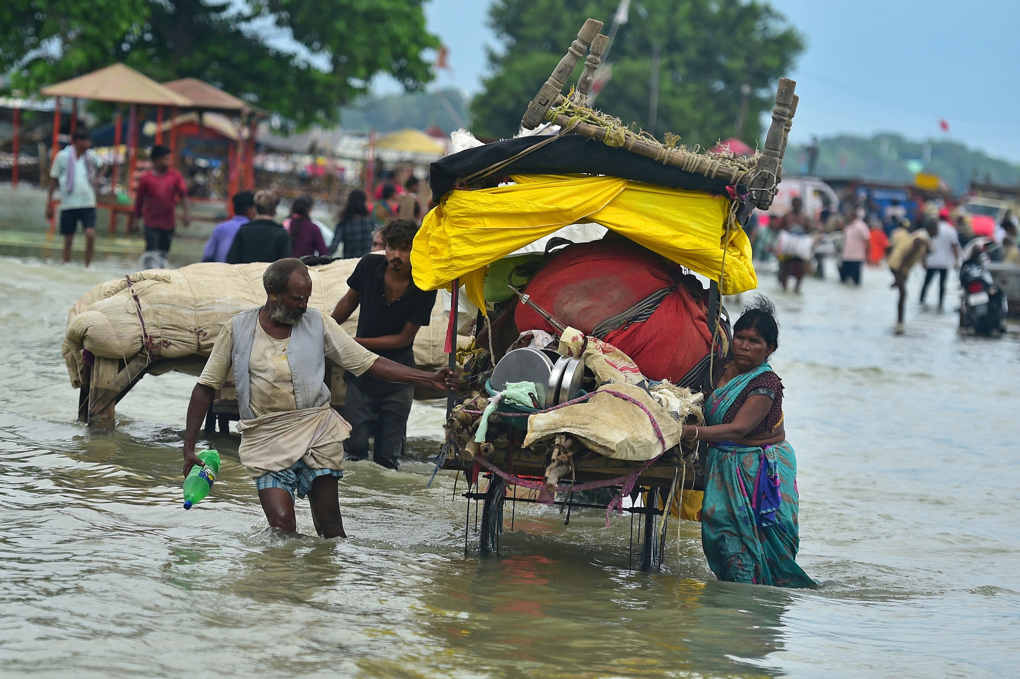 人们在印度普拉亚格拉吉推着自己的物品穿过洪水,时间是8月6日。