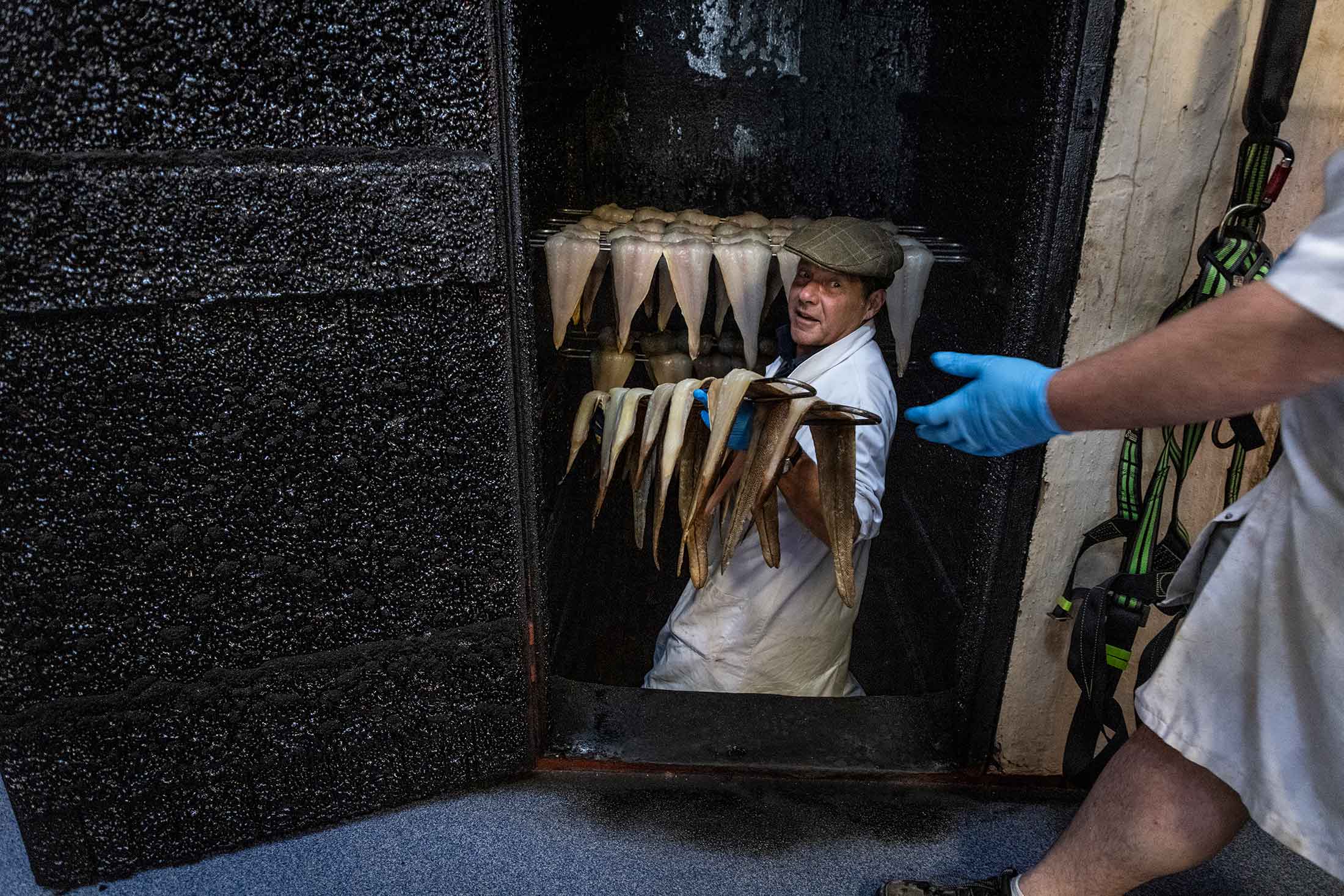 阿尔弗雷德·恩德比传统烟熏房的老板帕特里克·萨尔蒙正在往烟熏炉里装鳕鱼。摄影师:Jason Florio,彭博市场### 易于理解的解释