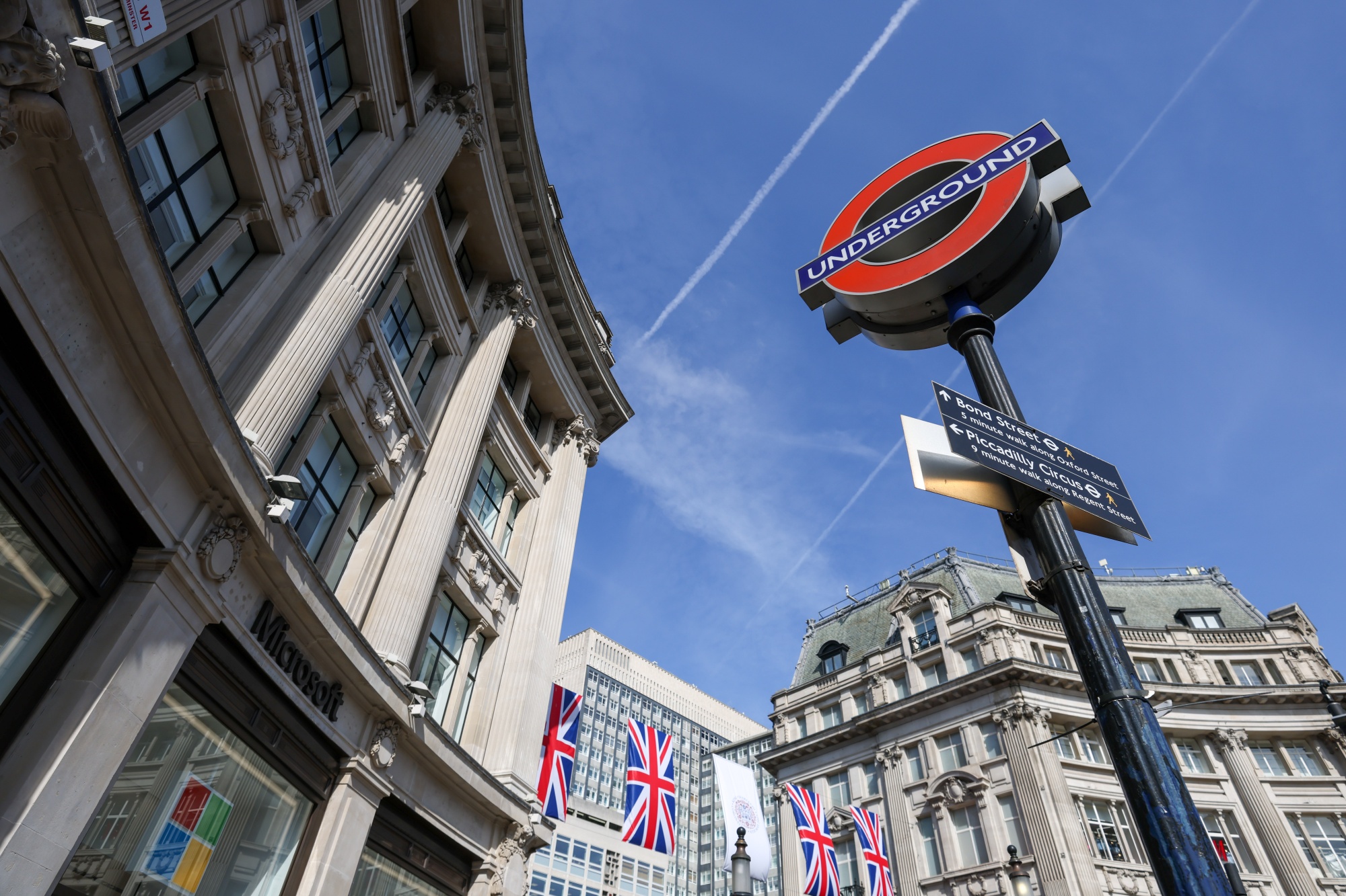 英国联合旗帜在伦敦牛津街的牛津广场。