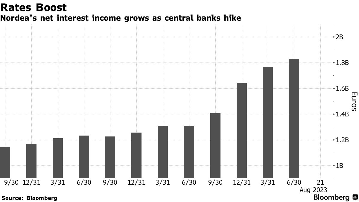 诺迪亚和其他同行一样,受益于一年来的央行加息,这提高了传统业务的利润,因为他们将抵押贷款的利率提高得比存款账户支付的利息更多,从中获利。除芬兰外,该银行还为瑞典、丹麦和挪威的零售客户提供服务。