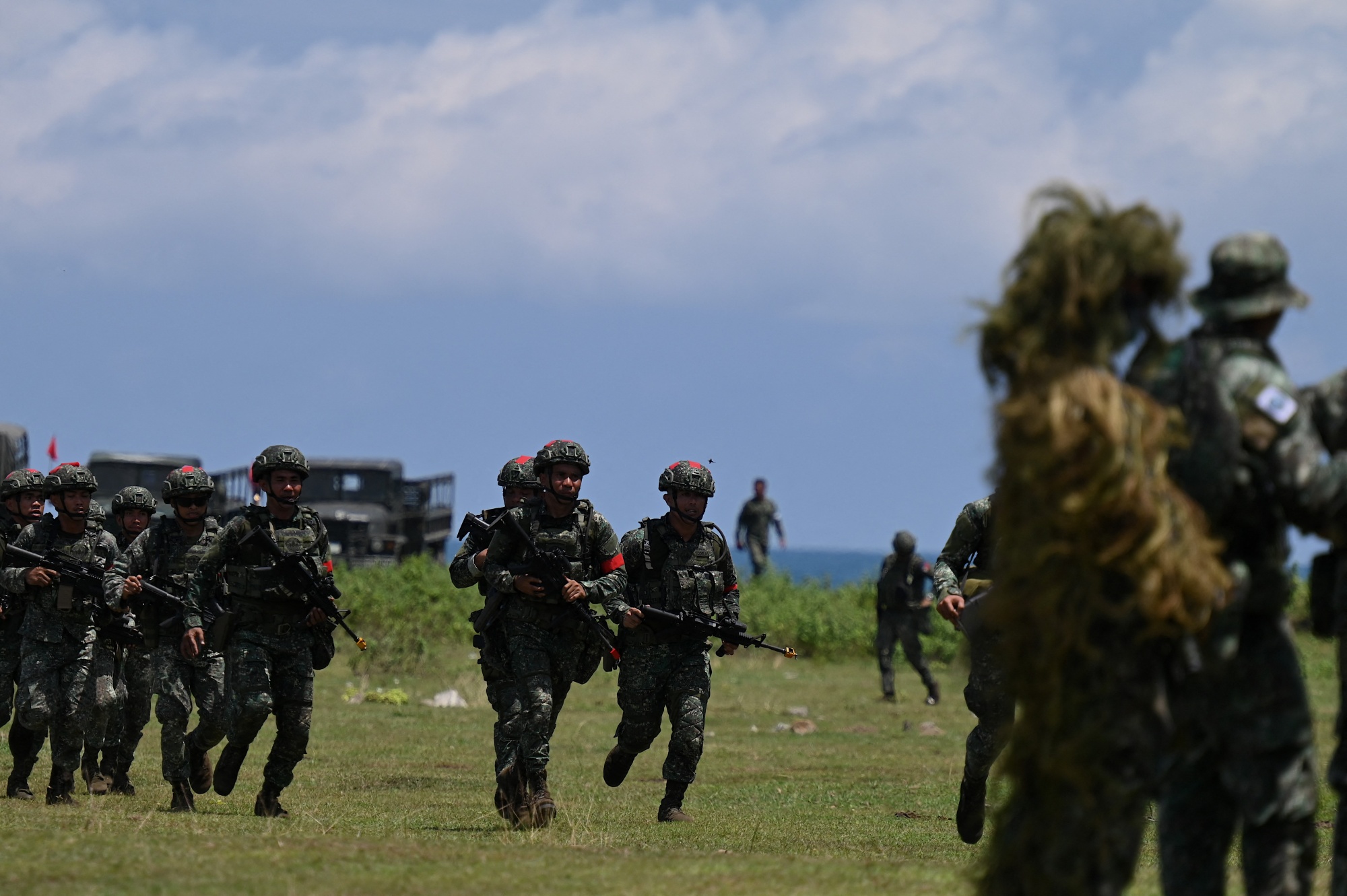 士兵们参加了一场作为菲律宾武装部队和澳大利亚国防军之间所谓的“阿隆演习”印太探索2023的一部分的战斗演习,于2023年8月21日在巴拉望省里萨尔的塔兰皮塔奥机场举行,