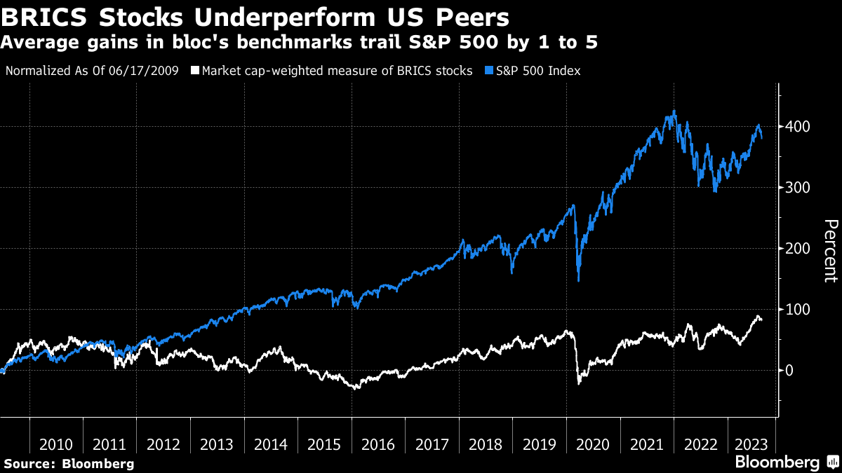 自2009年以来,五个金砖国家股票的市值加权指数上涨了81%,而标普500指数则上涨了379%。考虑到这段时间他们货币贬值的影响,他们的美元回报看起来要差得多。