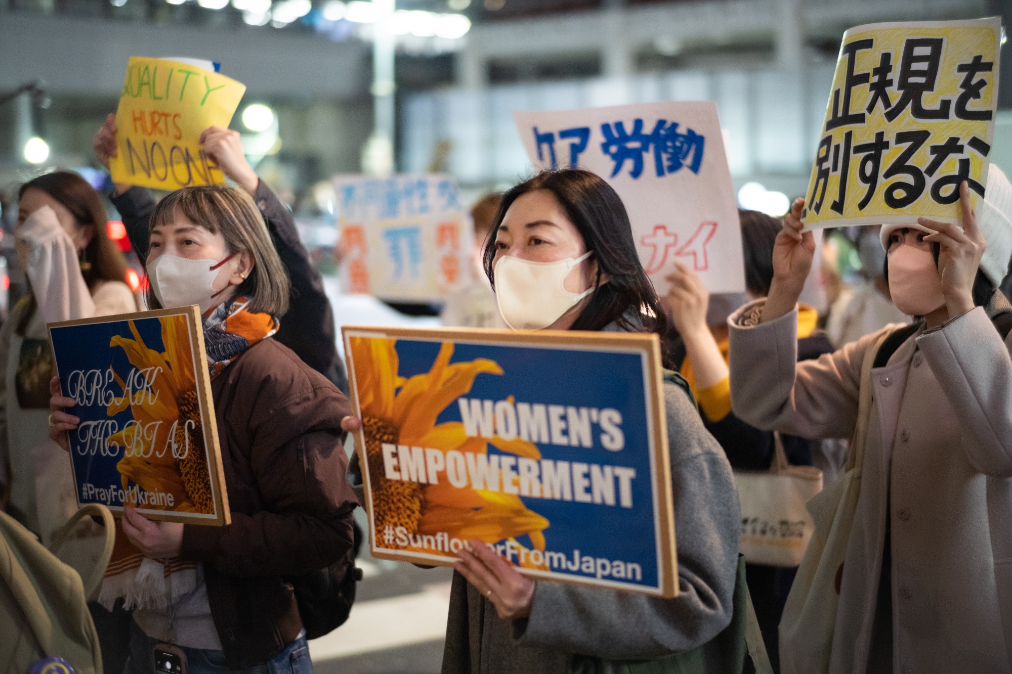 示威者在今年早些时候东京的妇女节游行中举着标语牌。越来越多的日本妇女选择不要孩子。