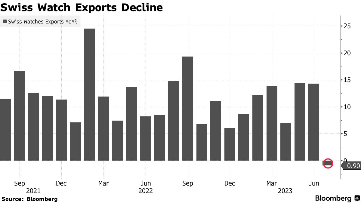 瑞士手表出口在7月略有下降,这是两年多来的首次月度下滑,随着对昂贵手表的需求开始在价格上涨和经济压力下放缓。