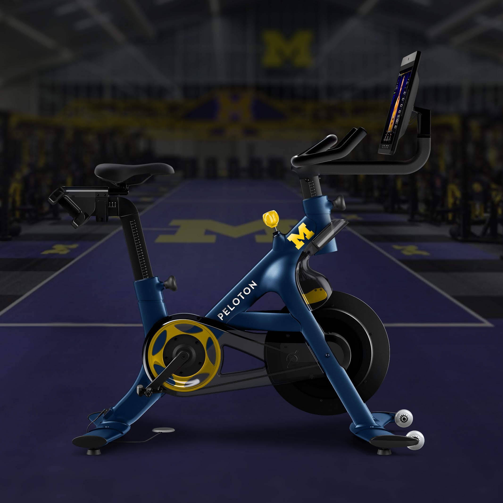 密歇根大学颜色为蓝色和玉米色的 Peloton 自行车将出现在橄榄球比赛的场边。该公司还将赞助男子和女子篮球比赛的“Maize Rage”学生加油区。学生可以以6.99美元的价格获得 Peloton 的 App One,而不是通常的12.99美元。