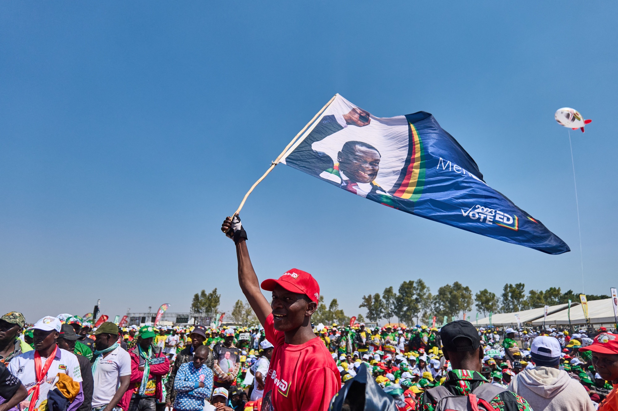 一名支持者在8月19日的选举竞选集会上挥舞着印有津巴布韦总统埃默森·姆南加古瓦形象的旗帜。