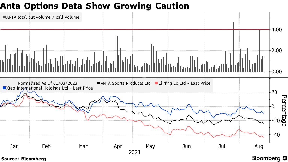在安踏发布业绩之前,悲观的期权交易活动和分析师的大幅降价预期表明投资者对安踏的谨慎情绪正在增加。消费者需求疲软以及来自耐克和阿迪达斯的竞争也给这家运动服装制造商及其国内同行带来了压力。该公司股价从一月的高点下跌了约37%,而李宁公司的股价自那时以来已经下跌了一半以上。与此同时,香港的基准指数下跌了约22%。
