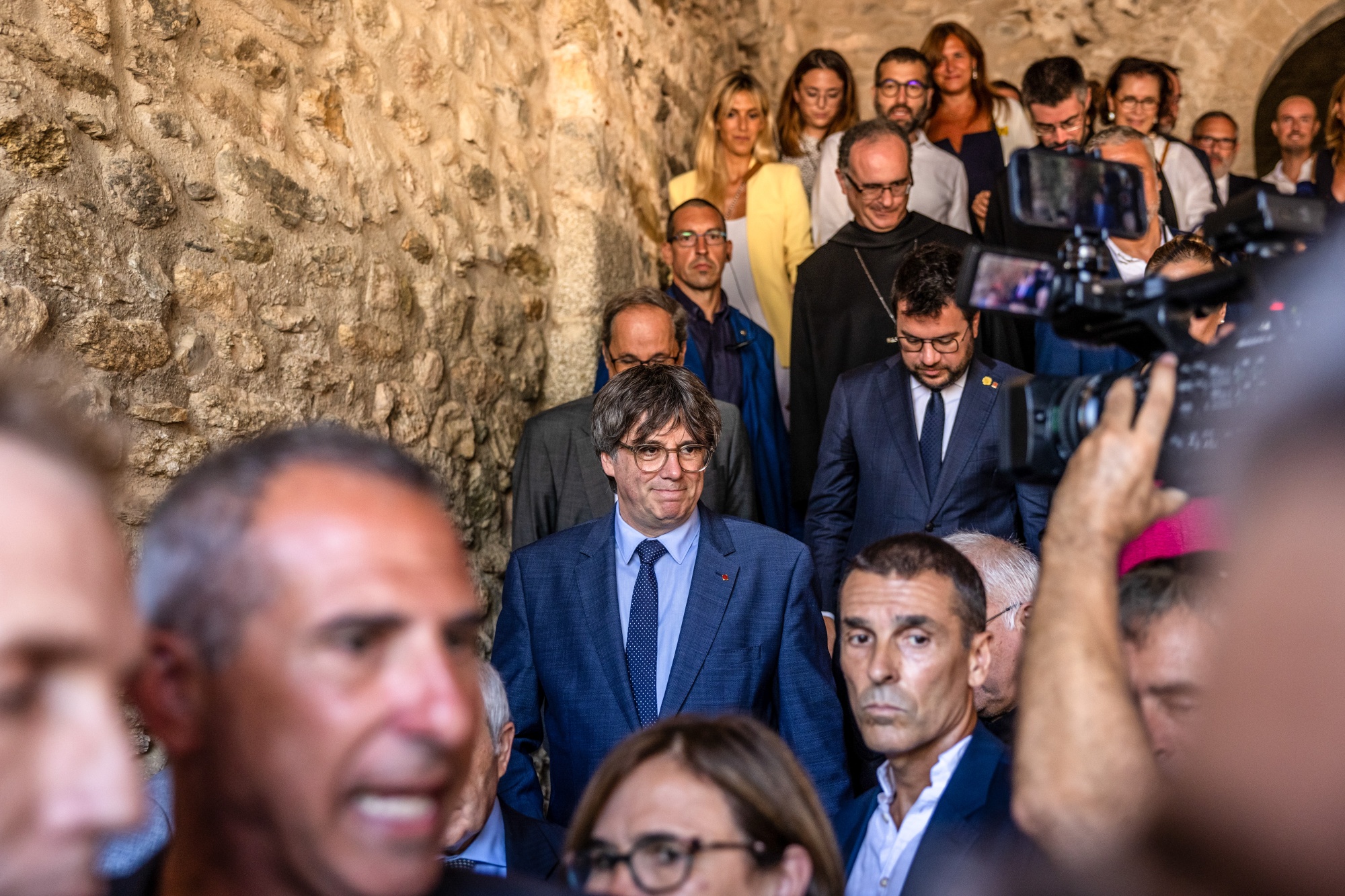 五位发言人——现任加泰罗尼亚总统和四位前任——受到热烈掌声欢迎,向生活在山区的著名大提琴家致敬。但很快就清楚了,欢呼的人群是为了欢迎谁而来:他们的流亡领袖,他突然发现自己在西班牙最新政治戏剧中扮演主角。
