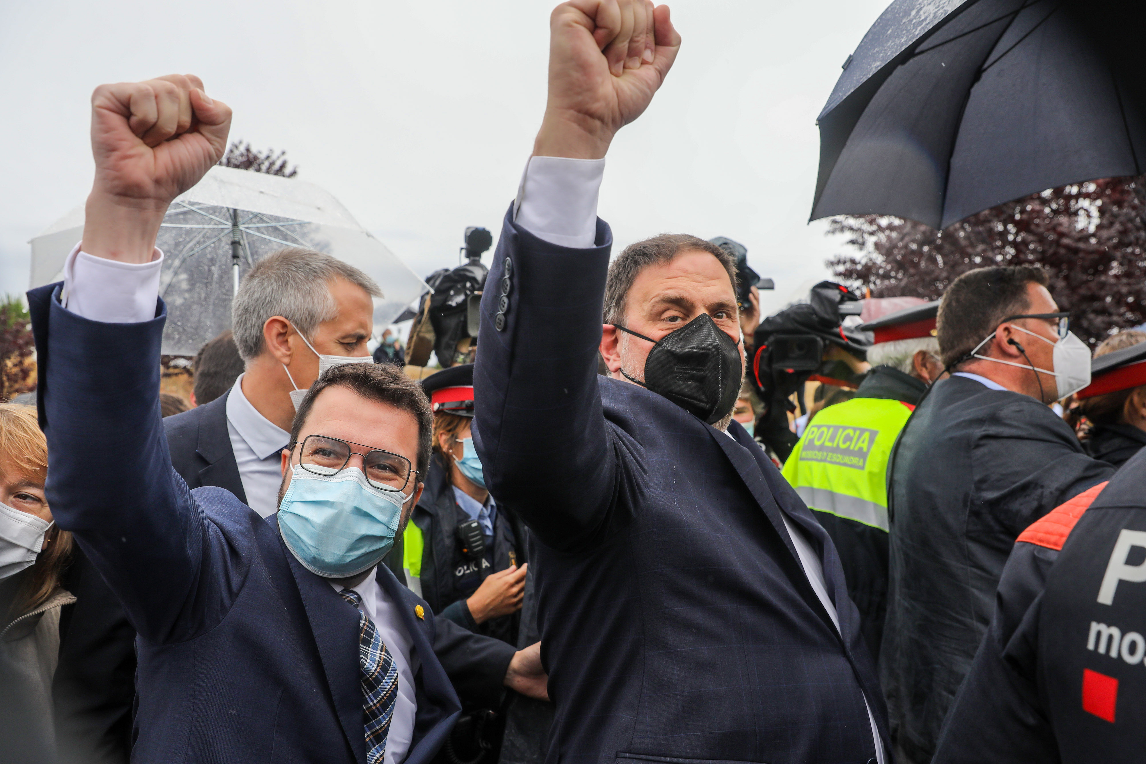 佩雷·阿拉戈内斯,加泰罗尼亚总统,左,和被赦免的分裂主义者奥里奥尔·朱昆拉斯,加泰罗尼亚共和国左翼领袖,于2021年6月在巴塞罗那监狱外向人群致意。摄影师:安赫尔·加西亚/彭博社桑切斯则试图在加泰罗尼亚重新赢回选民,传统上是社会主义的大本营,直到2010年代独立运动开始崛起,通过缓解政治紧张局势。最值得注意的是,他赦免了因参与独立宣言而被监禁的九名分裂主义领导人。