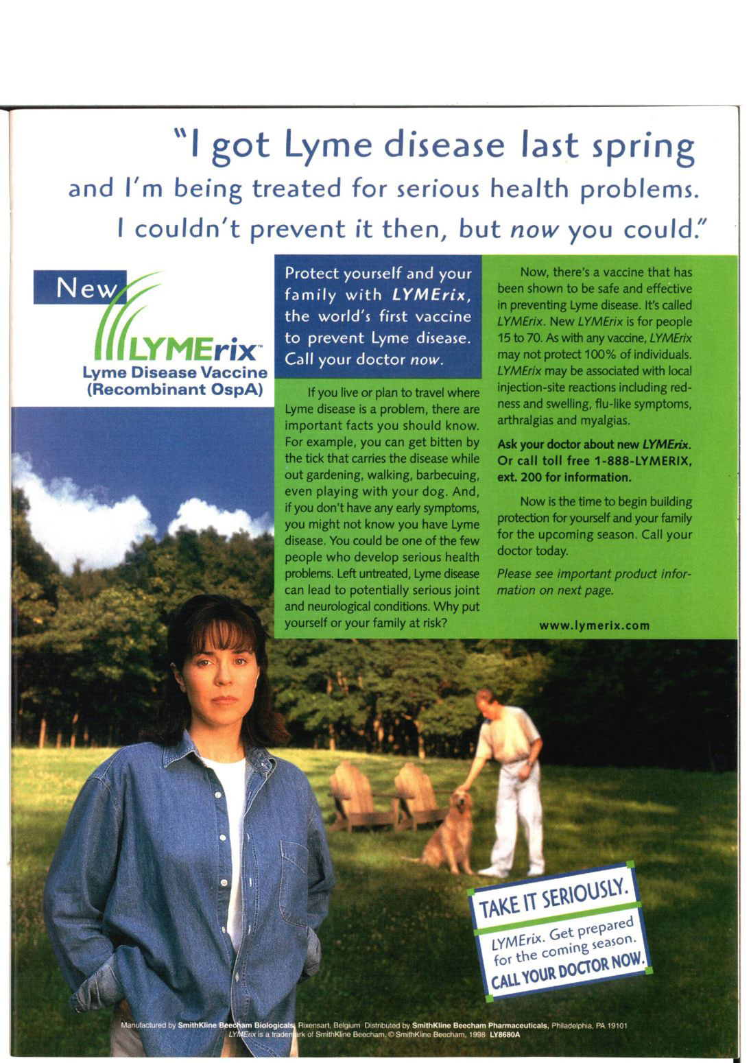 这并不总是这种情况。1998年12月,药厂史密斯克莱恩比奇公司(现为 GSK公司)获得了第一款针对人类的莱姆疫苗Lymerix的批准。该疫苗的广告特色是一个站在青翠草坪上的女人,她警告说:“去年春天我得了莱姆病,现在正在接受治疗严重的健康问题。当时我无法预防,但现在你可以。” Lymerix被证明能够预防该疾病约75%的时间,这相当有效;每年的流感疫苗的有效率在40%至60%之间,取决于年份。而且Lymerix是一个巧妙的科学成就。它在蜱虫体内中和了导致莱姆病的细菌。