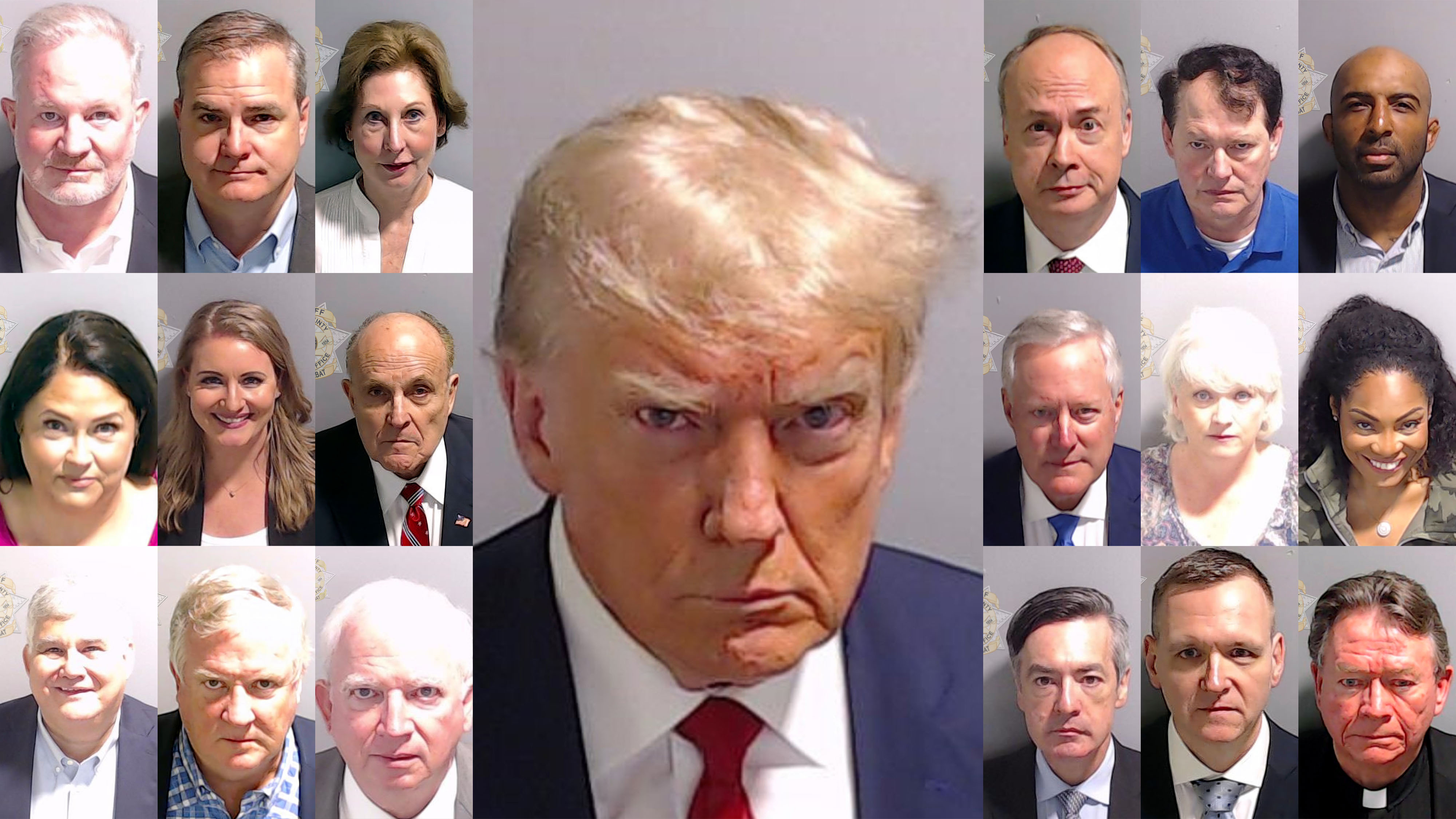 唐纳德·特朗普,中间,以及他在乔治亚选举阴谋案中的18名共同被告。