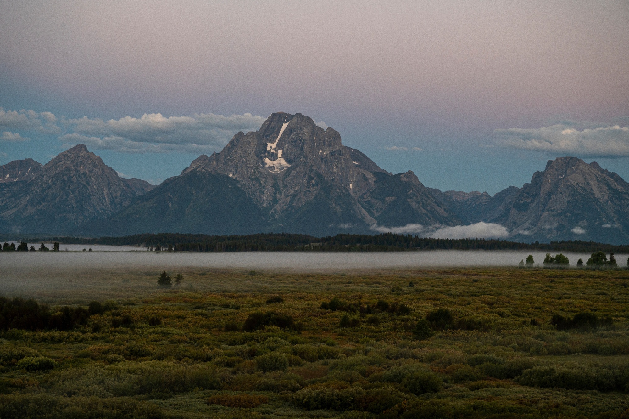 在怀俄明州杰克逊霍尔的日出时分,您可以看到大提顿山脉,这里是一年一度的经济研讨会的举办地。