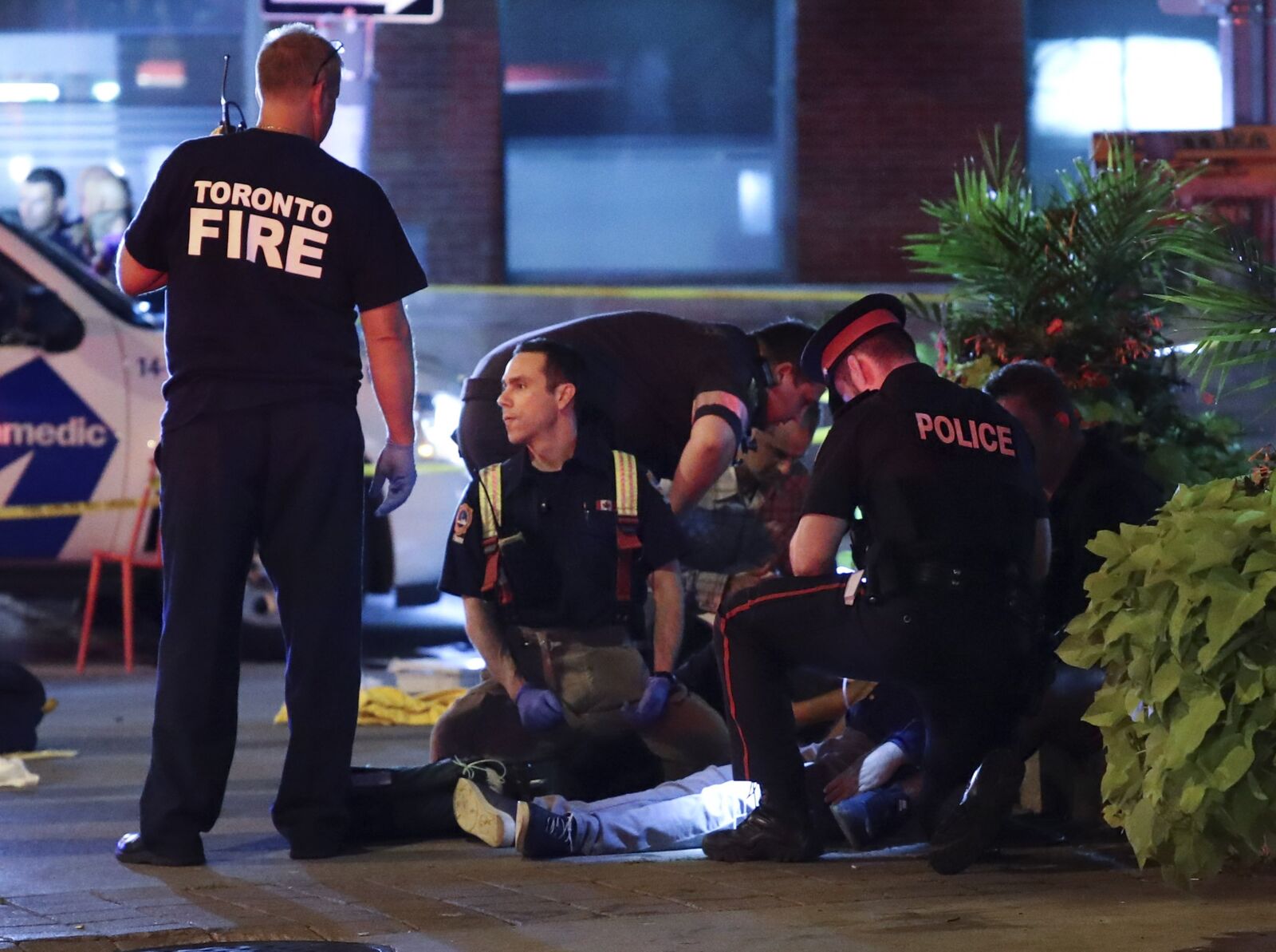 急救人员在2018年多伦多丹福斯区照顾一名枪击受害者。一名枪手的暴行造成两人死亡,13人受伤。摄影师:Richard Lautens/多伦多星报/Getty Images
