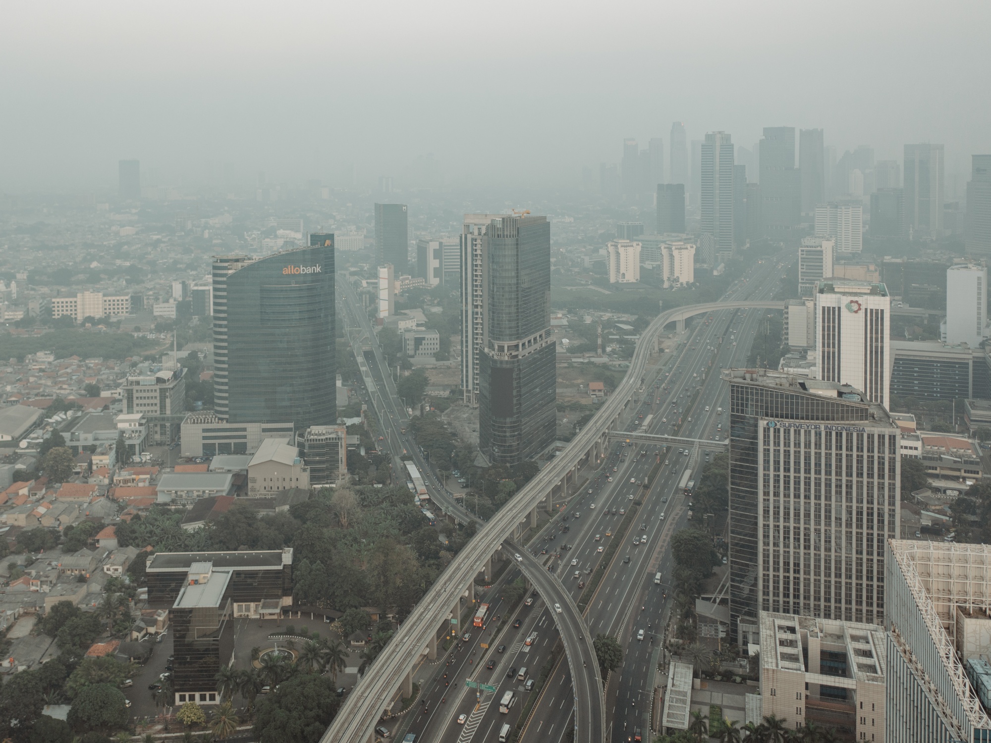 雅加达,印度尼西亚,8月22日,笼罩在烟雾中的建筑和高速公路。