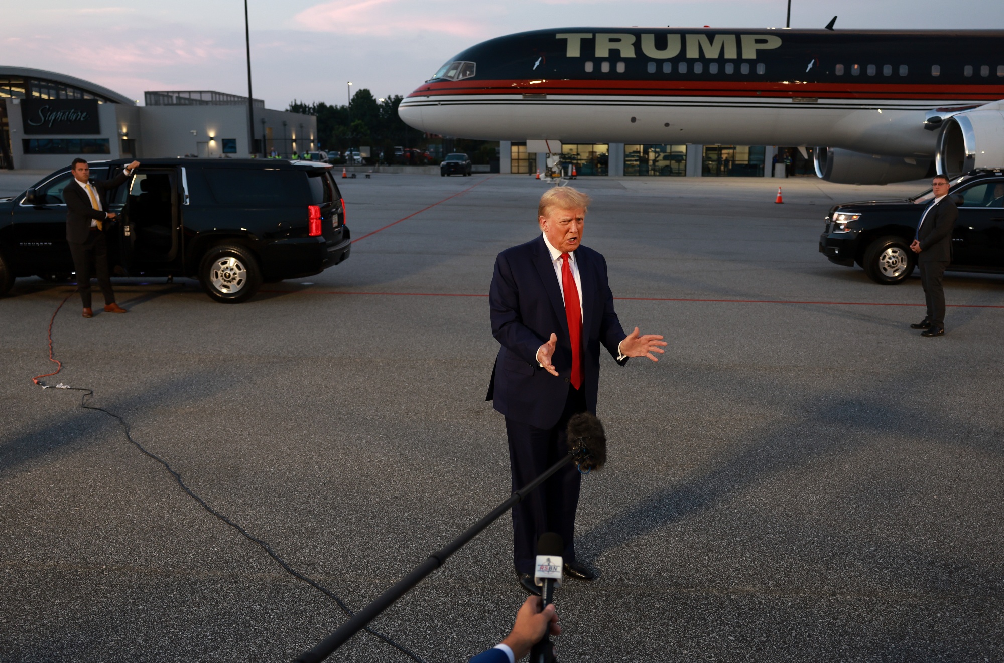 唐纳德·特朗普在亚特兰大哈茨菲尔德-杰克逊国际机场,8月24日在富尔顿县监狱投降后。摄影师:乔·雷德尔/盖蒂图片社北美“永不投降!”