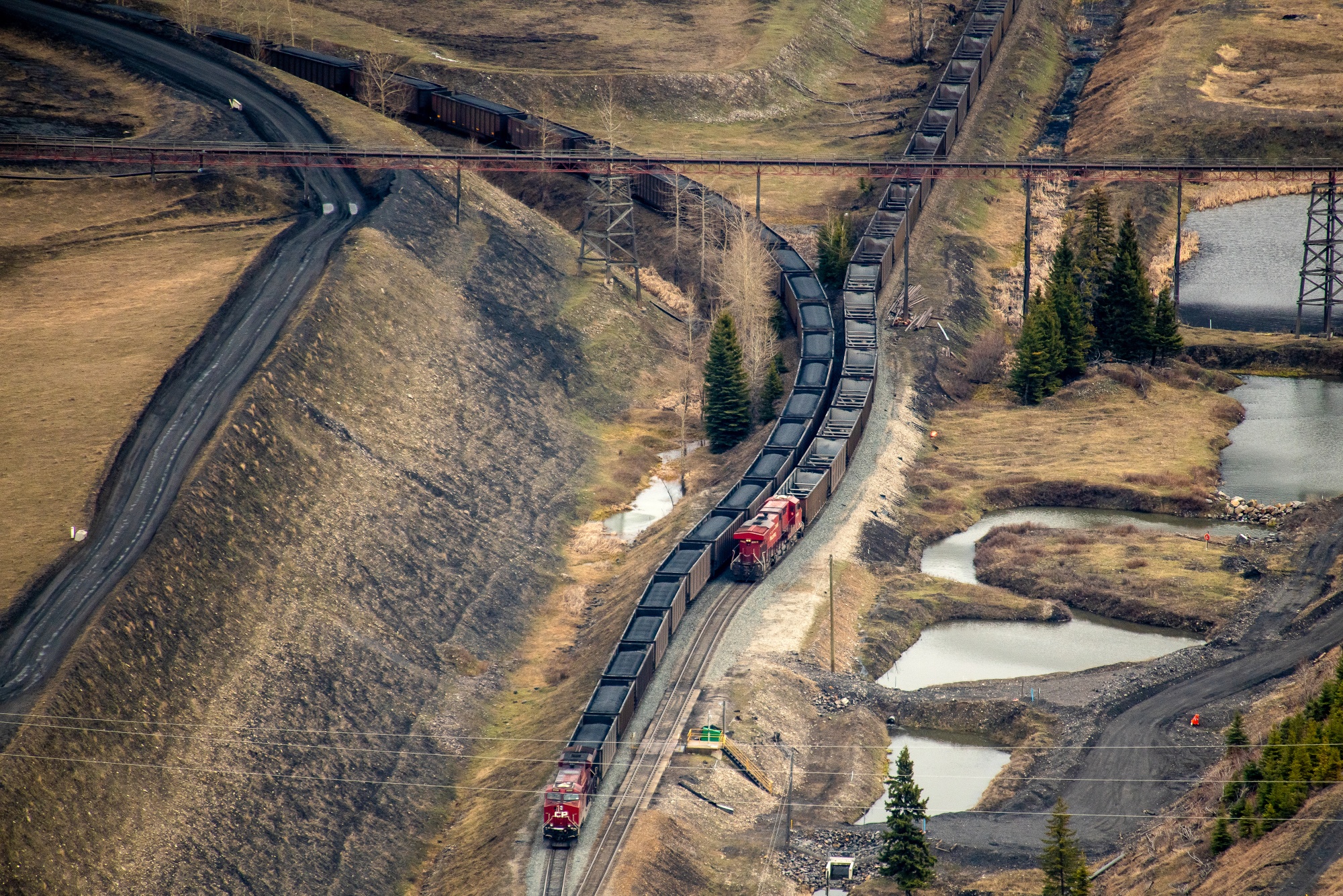 在加拿大不列颠哥伦比亚省的Elk Valley,Teck Resources Elkview Operations炼钢煤矿的火车车厢装满了煤。