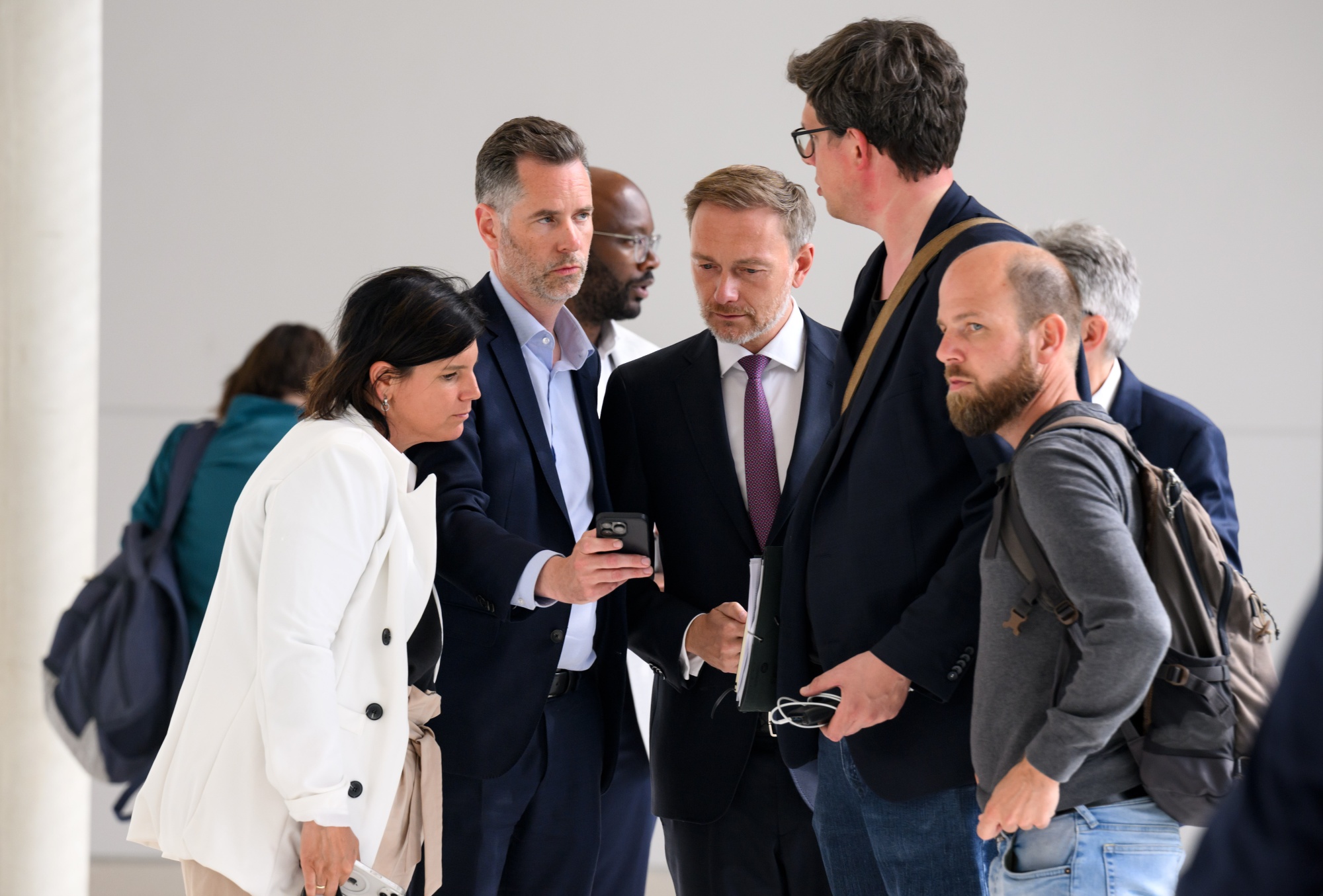 自由民主党议会成员克里斯蒂安·迪尔(Christian Dürr)(左二),自由民主党议会团主席克里斯蒂安·林德纳(中),于6月13日在德国联邦议院。摄影师:Bernd von Jutrczenka/picture alliance/Getty Images林德纳还通过对财政纪律的强硬立场来吸引他的支持者,包括他对限制联邦净借款的德国宪法债务限制的辩护。