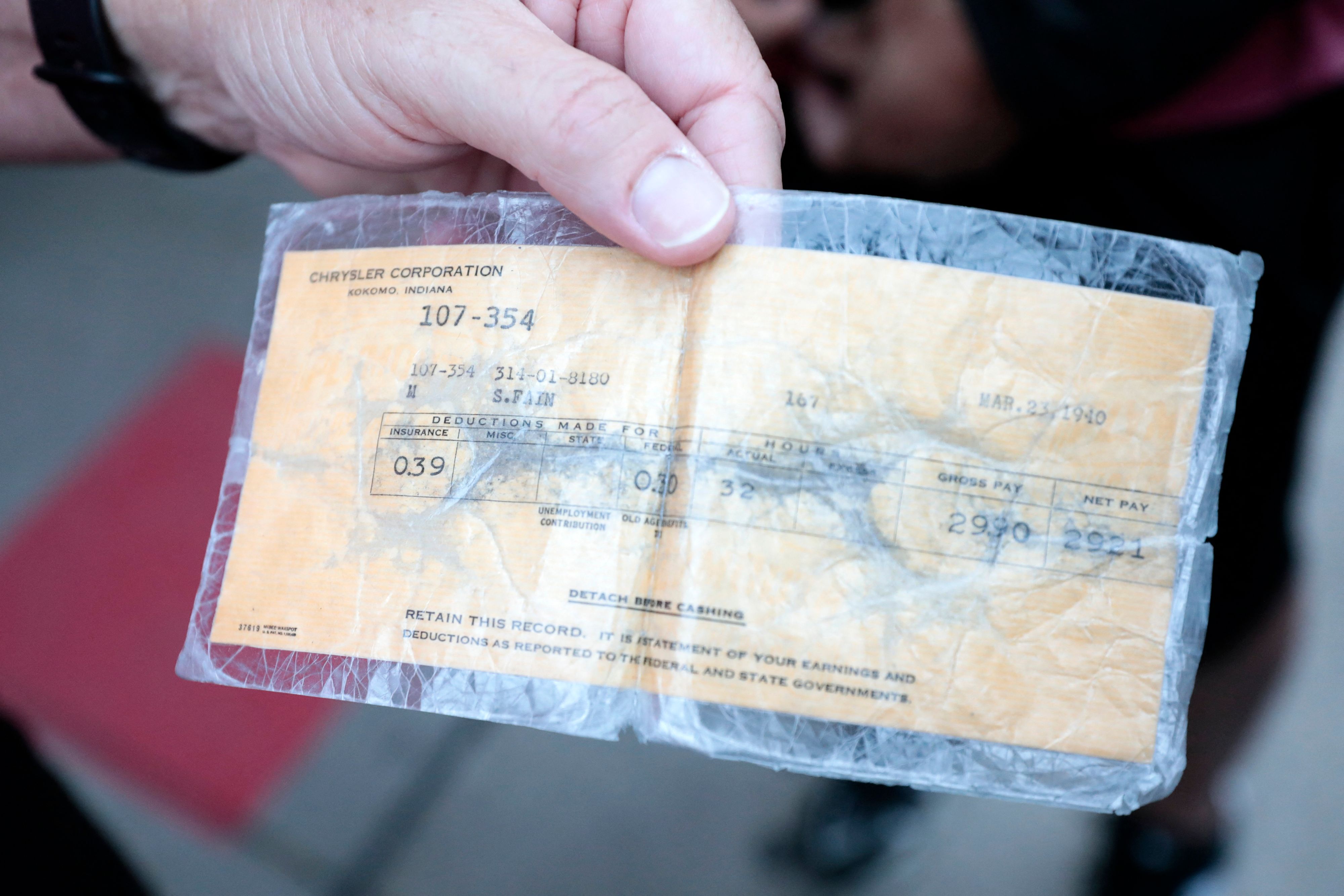 费恩在钱包里保存着祖父在1940年在克莱斯勒工作时的工资单。来源:法新社费恩的父亲深深参与民主党政治,肖恩在“竖立庭院标志、敲门拜访和参加辣椒晚餐”中长大,他说。“我小时候讨厌这些。”