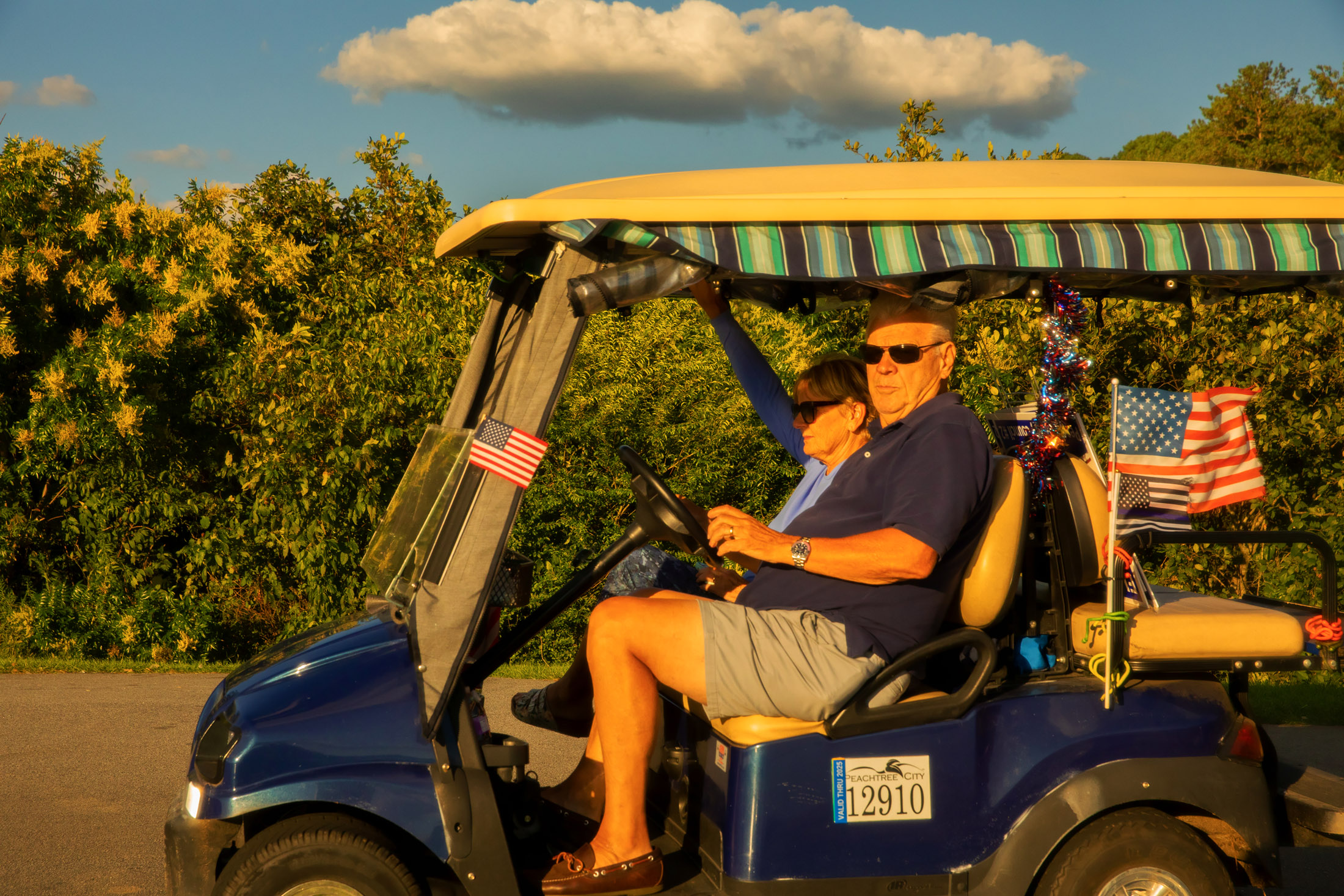 高尔夫球车乘客在桃树城享受阳光。摄影师:Levi Mandel