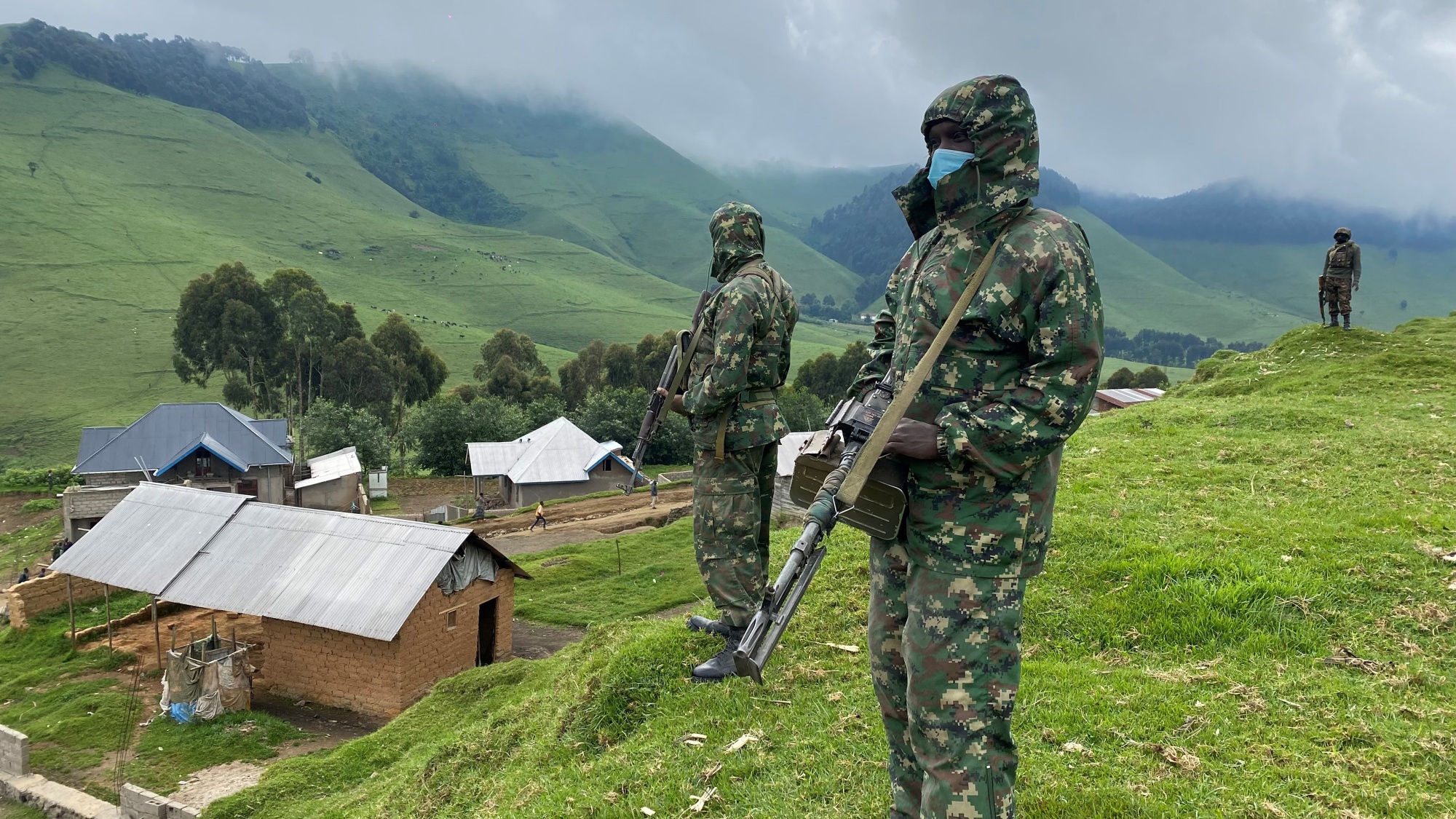 刚果民主共和国地区部队士兵在四月份在北基伍省的穆沙基巡逻。