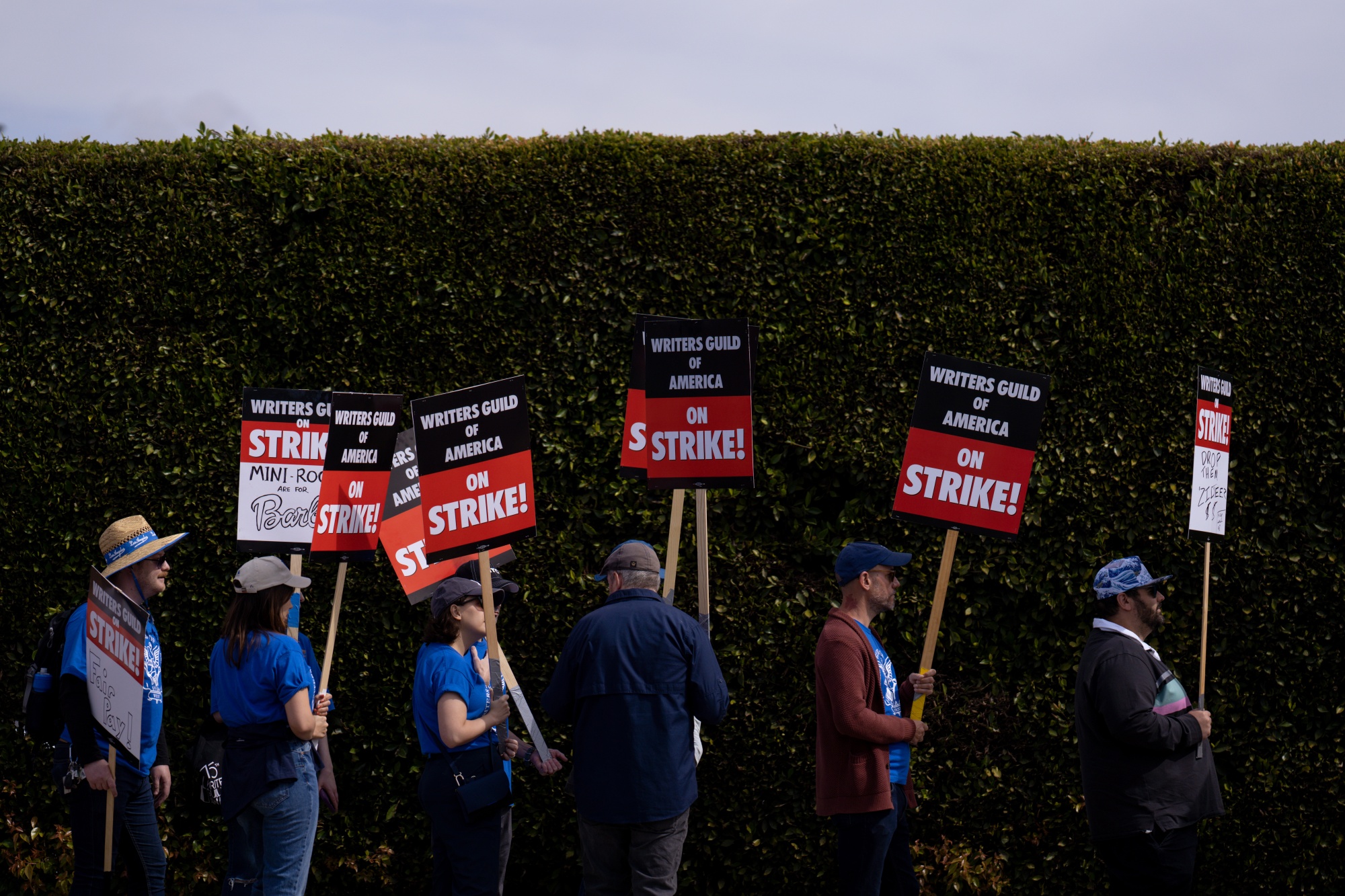 美国编剧工会会员和支持者在洛杉矶的罢工线上。