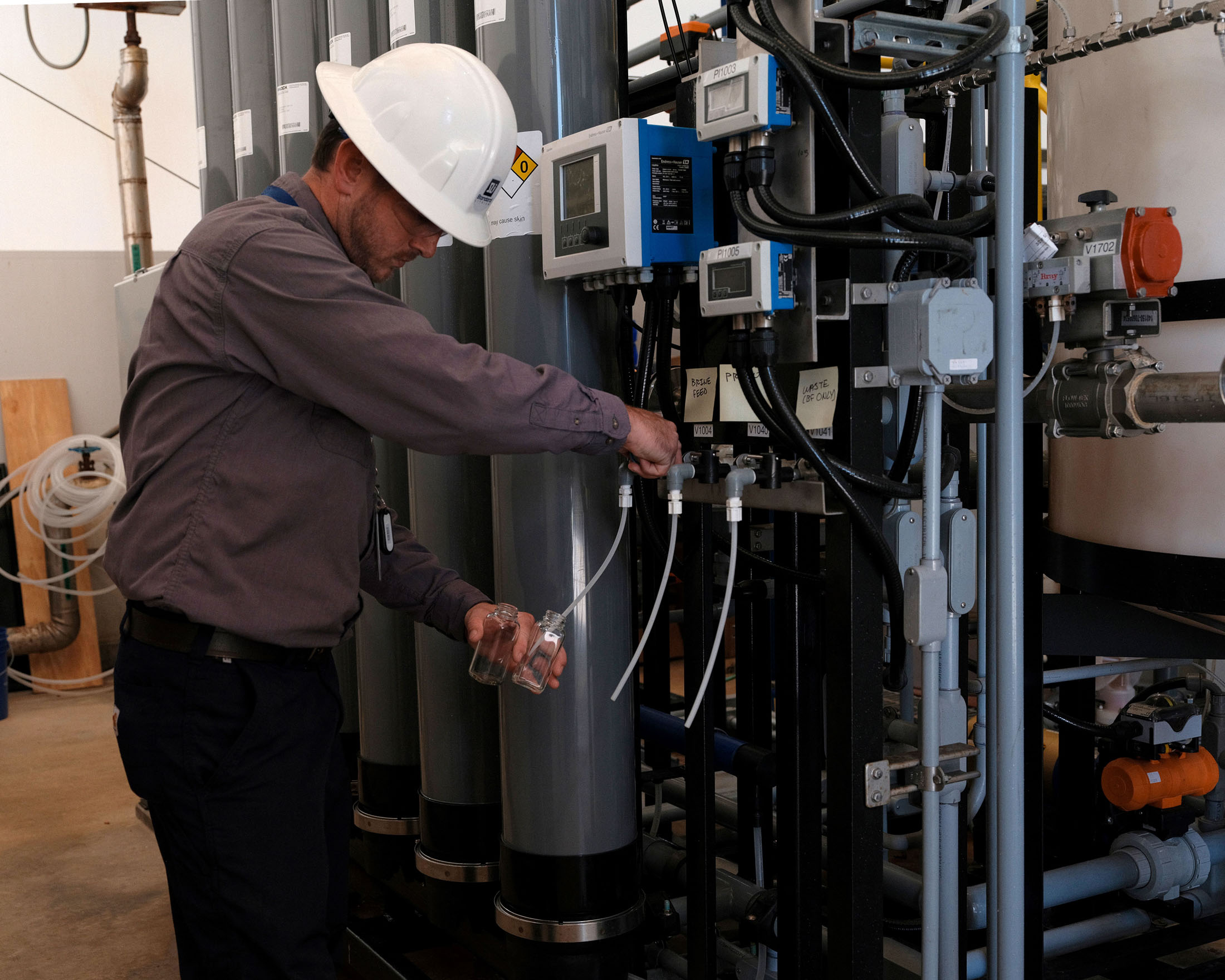 Standard Lithium的演示工厂使用的技术旨在在几天内从卤水中回收锂,比传统的回收方法快得多。摄影师:Rachel Boillot/BloombergDLE旨在通过使用过滤器和膜等设备直接去除锂并允许剩余物质返回地下卤水湖来解决这些问题。这个过程比蒸发池快得多,占用的空间也更少。所有这些都将减少对脆弱的沙漠生态系统的影响 — 这对于汽车制造商及其投资者、当地社区和政府来说是一个可接受的解决方案。