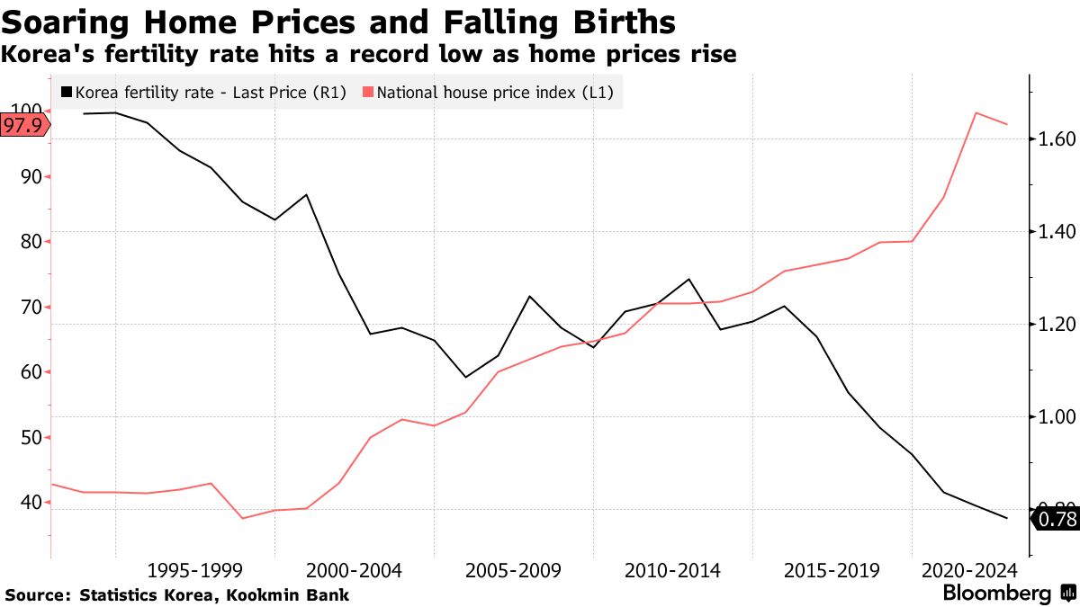 韩国多年来一直拥有世界上最低的生育率。这一比率在2022年降至0.78,指的是预计一个女性一生将生育的孩子数量。高涨的房价经常被认为是那些不愿意生孩子的人的原因之一。