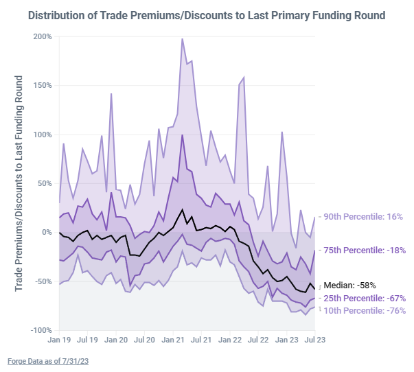 尽管兴趣有所增加,但仍然保持在低位。根据私人市场交易平台Forge的数据,私人公司的交易价格与去年7月的最后一轮融资相比折价约58%,尽管这已经从5月的61%下降,但却比6月的52%上升。