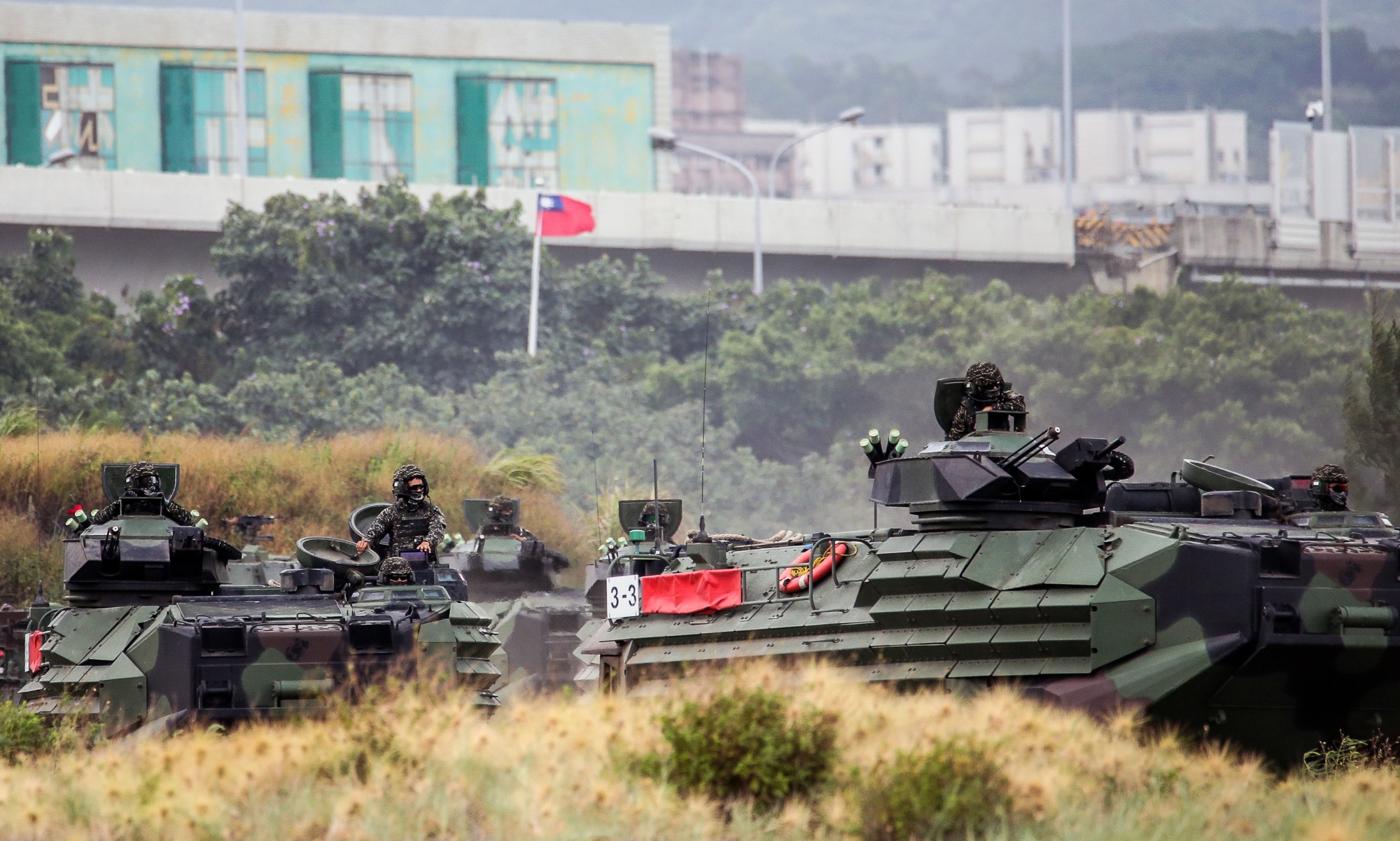 在台湾新北市的巴厘海滩上,突击两栖车在汉光军事演习期间展示,时间为7月27日。