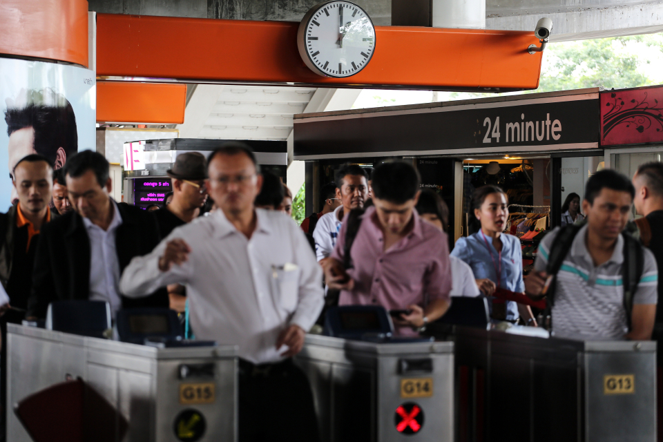 通勤者穿过曼谷中心的Mo Chit车站的闸门。摄影师:Dario Pignatelli/Bloomberg