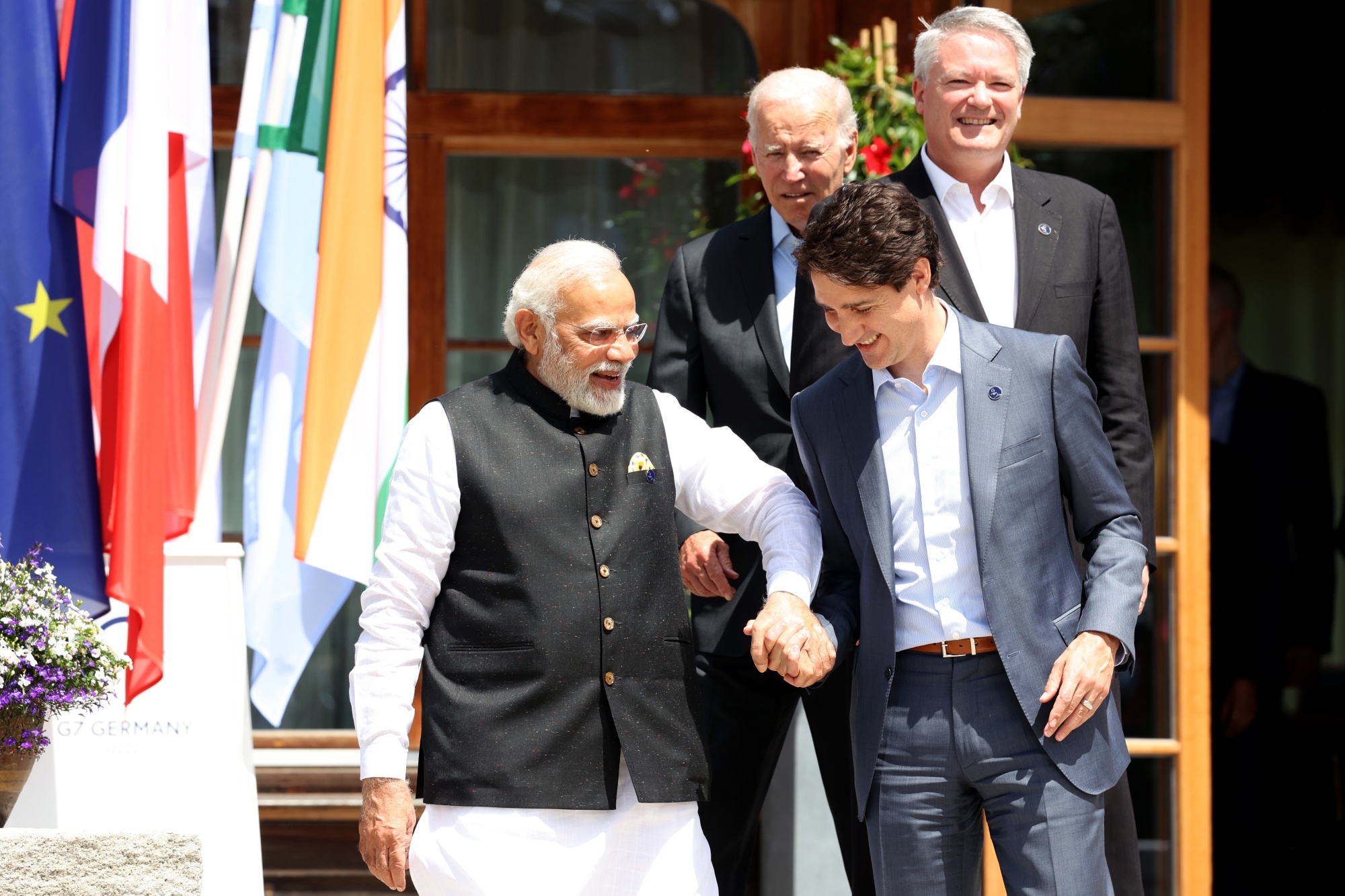 纳伦德拉·莫迪和贾斯汀·特鲁多在德国举行的2022年七国集团峰会上。摄影师:Liesa Johannssen-Koppitz/Bloomberg订阅印度版新闻简报,由Menaka Doshi提供 - 一份关于这个新兴经济强国、其背后的亿万富翁和企业的内幕指南,每周发送一次。