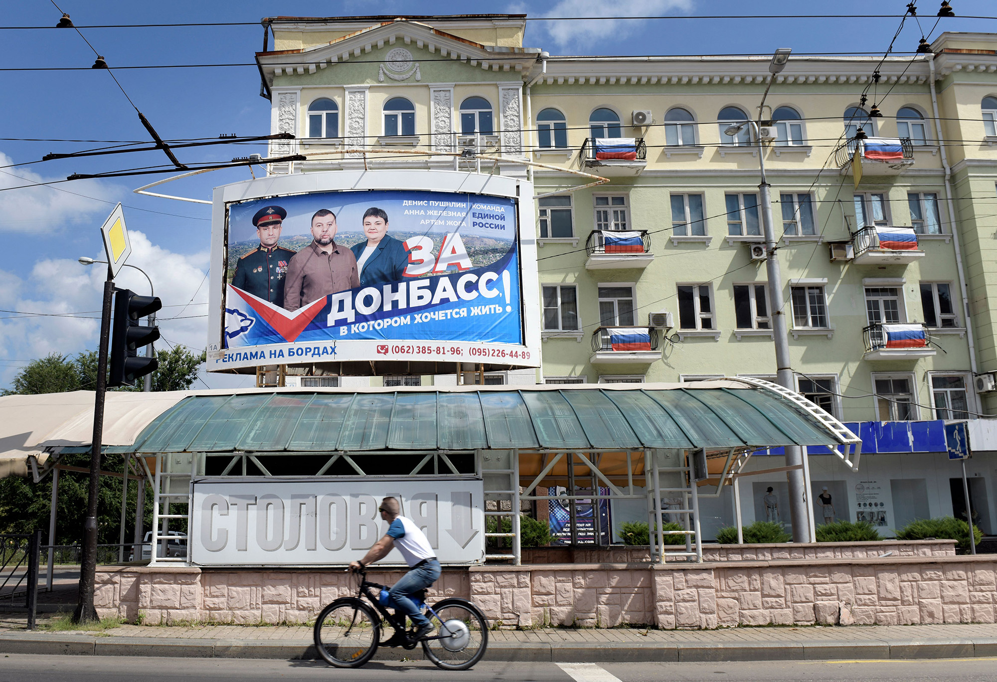 在顿涅茨克市中心的一条街上,有一张地方选举竞选海报。