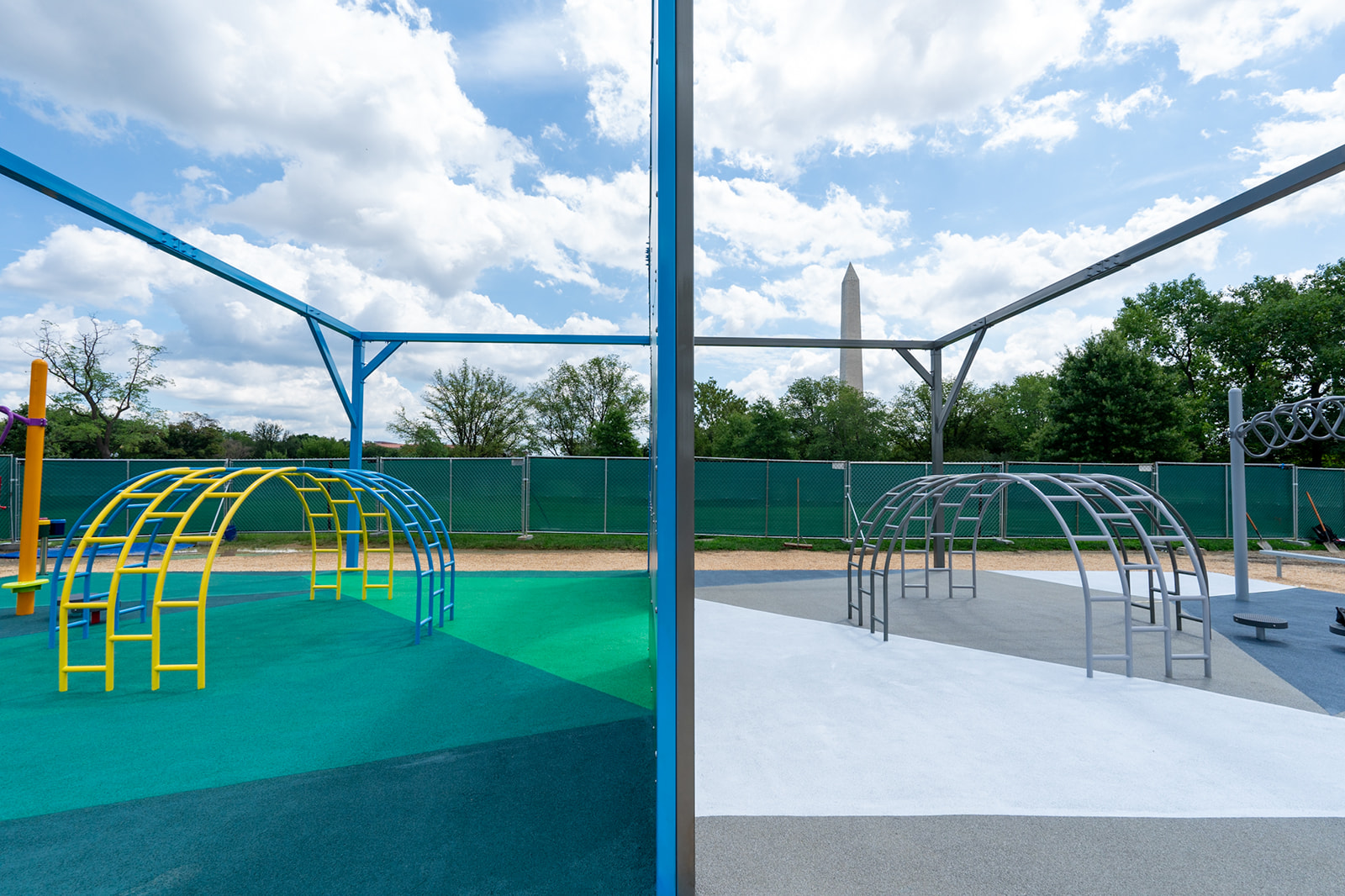 美国最高法院在其1954年的里程碑性裁决中结束了各州公立学校的种族隔离,这是在布朗诉教育委员会案中做出的。但这并不适用于哥伦比亚特区的学校,因为哥伦比亚特区不是(至今仍然不是)一个州。这张分隔操场的超大照片是在1954年另一项裁决(波林诉沙普案)之后拍摄的,该裁决发现在特区的学校和设施中实施种族隔离也是违宪的。在国家广场上看到任何与当地历史有关的展品是很罕见的;来这里为国家博物馆制作项目的艺术家们往往只把华盛顿特区视为游行和抗议的场所。《美国的游乐场:华盛顿特区》发现亚当斯决心利用国家广场来联系实际的当地黑人历史。