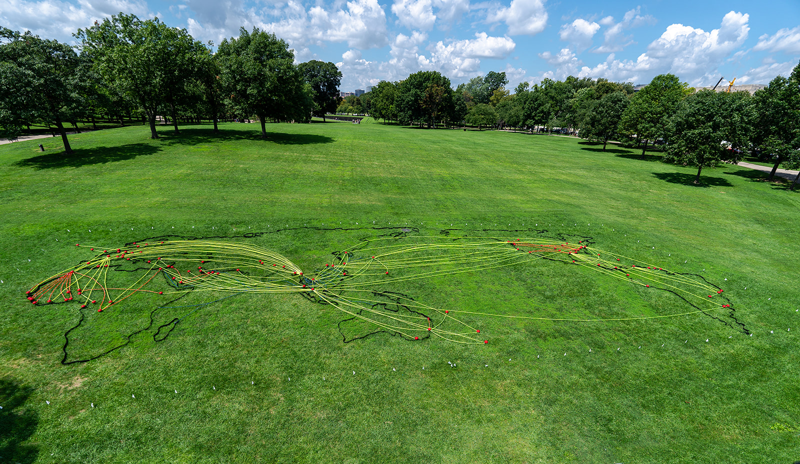 “为生者”(2023年),由蒂凡尼·钟创作的土地艺术作品,使用园艺材料描绘了逃离越战的难民和流亡者的路线。照片:AJ Mitchell摄影“超越花岗岩”中的一些作品只能在国家广场上展示。越裔美国艺术家蒂凡尼·钟的作品“为生者”既是对附近越战退伍军人纪念碑的回应,也是对其进行引用,这座现代主义纪念碑是由玛雅·林设计的。钟的景观装置形成了一幅世界地图,展示了越战期间和战后从越南流出的移民。与林的疤状纪念碑一样,钟的作品也是一个景观设计,但与林的正式纪念碑上的黑色花岗岩不同,钟使用了类似园艺边缘和绳索等易逝材料。她的材料暗示着匆忙和临时应变,以及对手头情况的应对:这是关于流离失所的作品的共鸣主题。