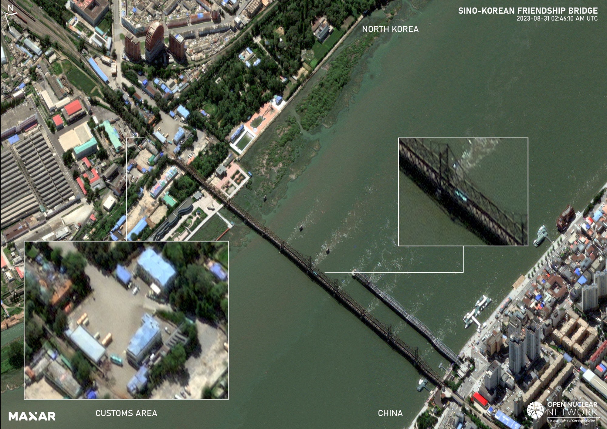 8月31日,连接朝鲜和中国的中朝友谊桥。来源:卫星图像(c)2023 Maxar Technologies。由Open Nuclear Network进行分析。卫星图像显示,朝鲜似乎派遣了一辆巴士穿越与中国相连的桥梁,这很可能是自平壤在近四年前疫情爆发时封锁边境以来的首次行动。