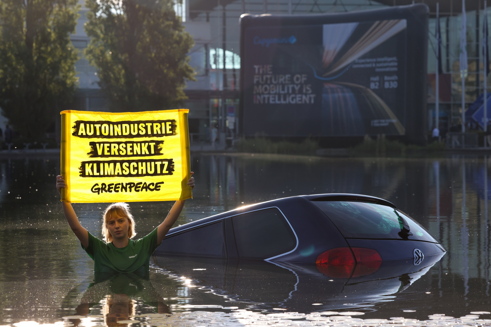 一名来自绿色和平组织的抗议者在德国慕尼黑举着横幅,上面写着“汽车行业沉没了气候保护”,时间是9月4日。摄影师:亚历克斯·克劳斯/彭博社一系列激进团体计划在IAA周围举行抗议活动。一些绿色和平组织的成员周一从慕尼黑一条主要交通干道上的高架桥绳降下来,而绿色和平组织的成员则将汽车底盘的部分零部件沉入展览中心前的一个人工浅水湖中。