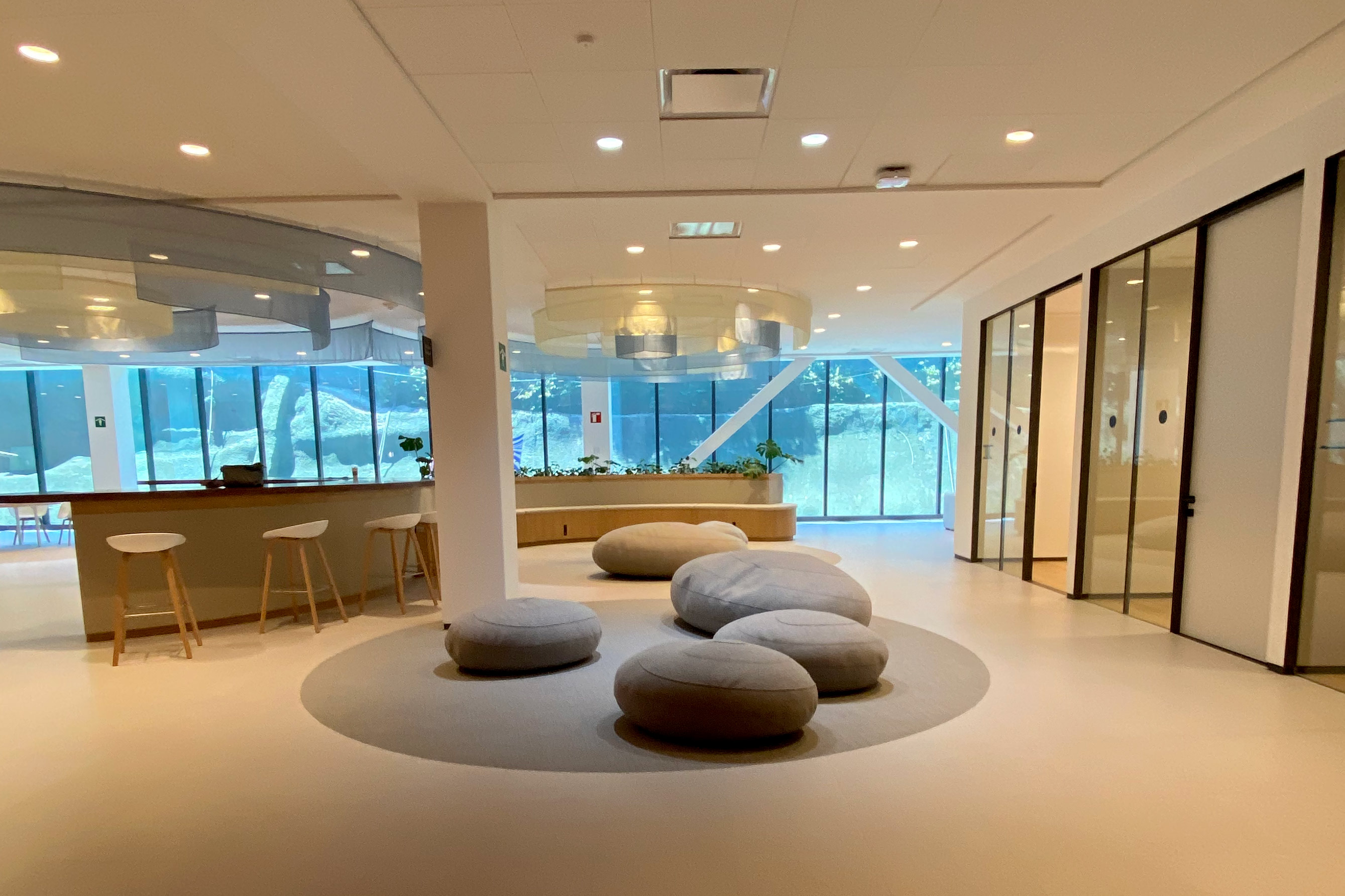 在大学的主楼周围走动感觉就像身处一个“探险陀螺”的塔内。中心是一个名为“自由核心”的开放式礼堂。从那里,大约100名观众可以欣赏到玻璃窗的图书馆,大木板和几个小会议空间,全部位于围绕礼堂的不同层级。