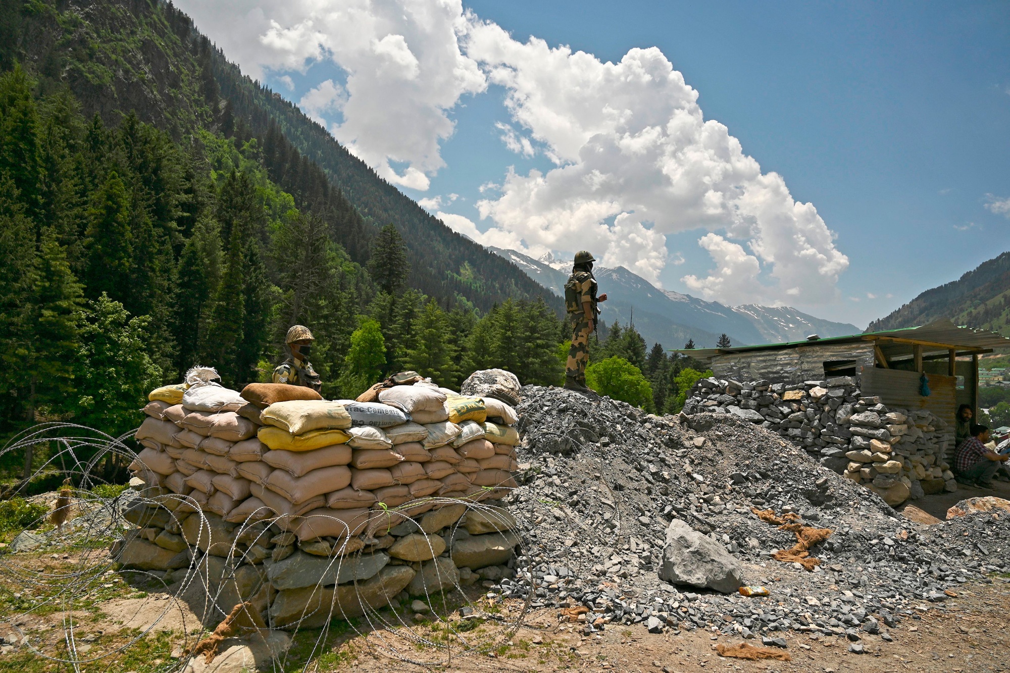 边境安全部队士兵在印度加甘吉尔(Gagangir)守卫通往与中国边境的公路。