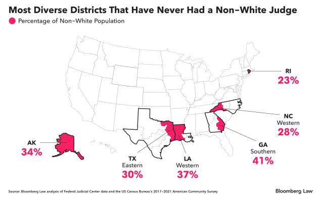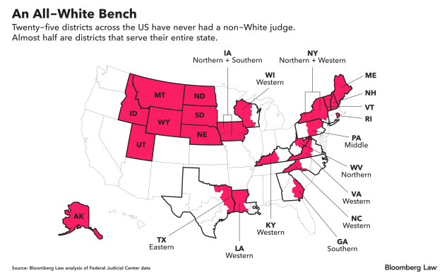 根据彭博法律对联邦法院记录的分析,94个联邦地方法院中有25个从未有过非白人法官。这不仅仅是南方的问题:从东北部到上大平原,有15个州的法院都在这个名单上。