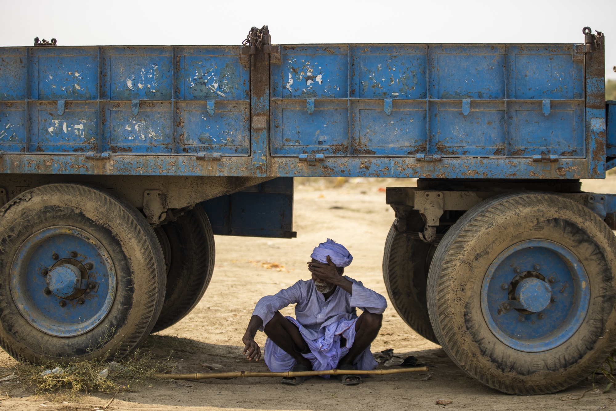 一个男人坐在印度北方邦的一辆卡车下的阴凉处。