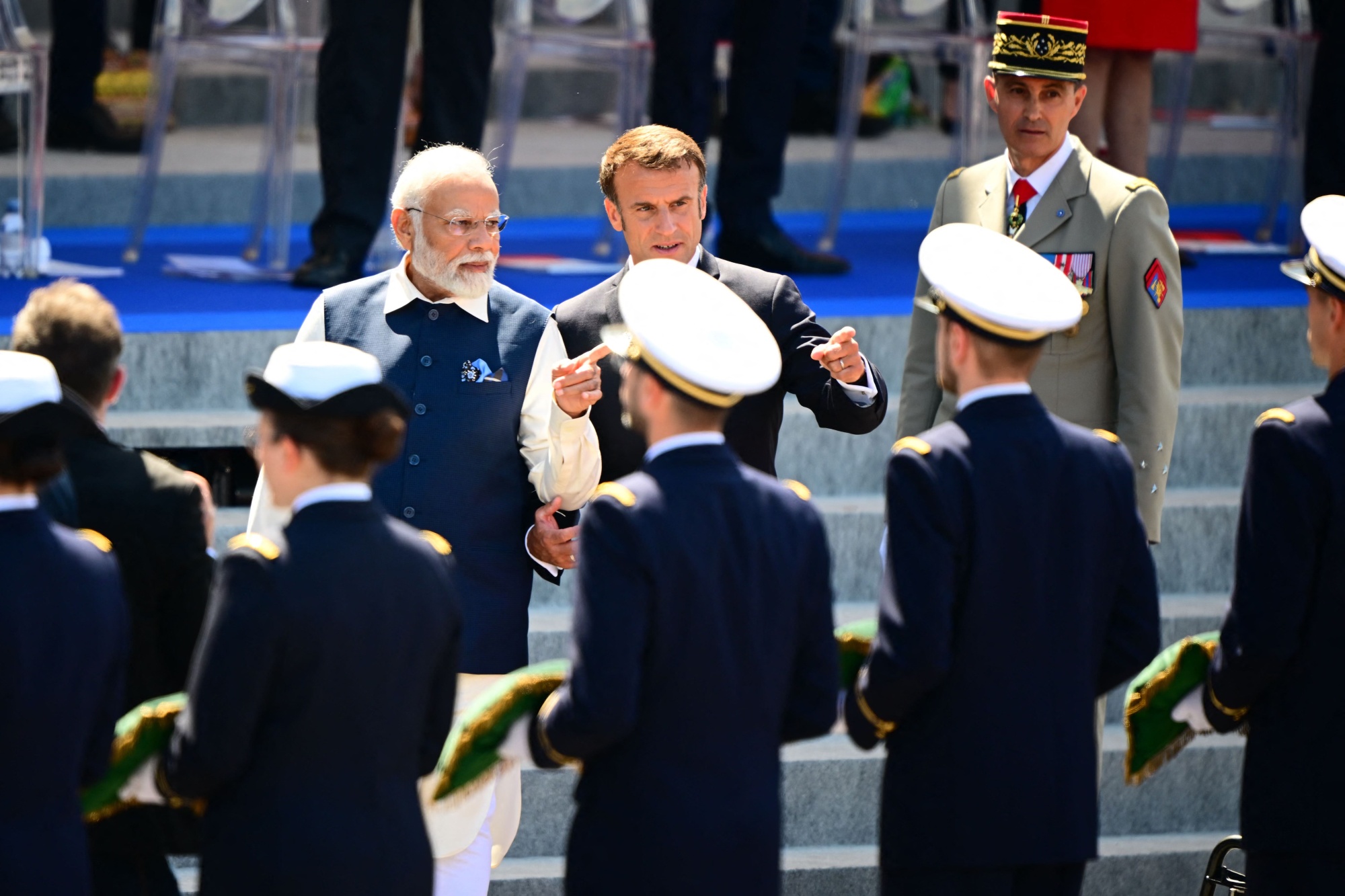 莫迪和法国总统埃马纽埃尔·马克龙在七月的巴士底日阅兵式上检阅部队。摄影师:Emmanuel Dunand/AFP甚至经济讨论也并不顺利。据两名熟悉讨论的人士透露,欧盟官员留下的印象是,尽管欧盟是世界上最大的单一市场,但印度却认为欧盟是一个日益无关紧要的老龄社会。