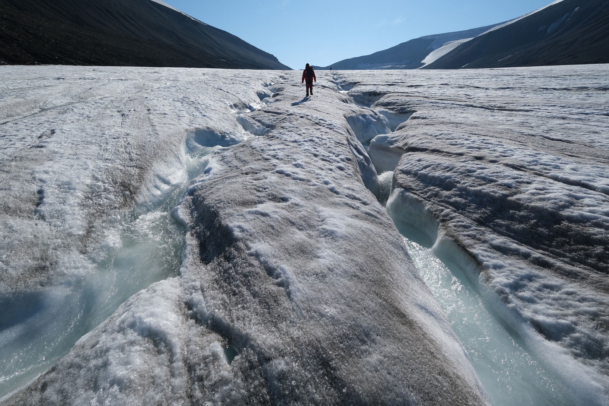 一名徒步者沿着斯瓦尔巴群岛的朗伊尔布林冰川行走。