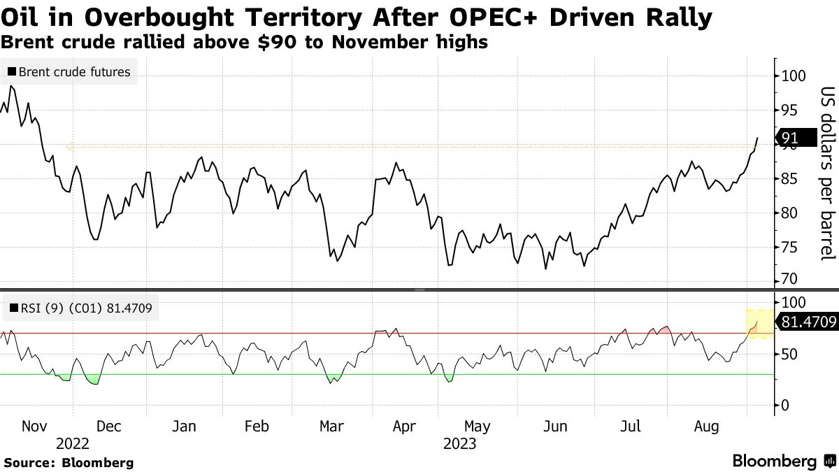 布伦特原油首次自11月以来飙升至每桶90美元以上,因最大的OPEC+产油国将供应削减延长至年底。