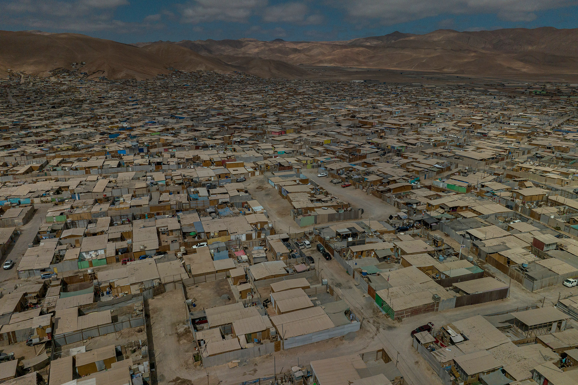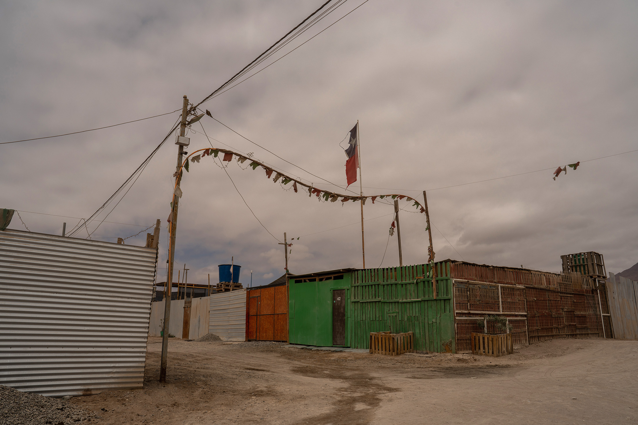 弗洛尔德波布拉西翁是智利人所称的“托玛”,或者说是土地占领,因为它是建在被没收的土地上。里面的房屋是匆忙建造的,使用周围任何可以找到的材料。墙壁大多是胶合板,锌板被缝在一起作为屋顶。四月的一个星期天下午,这里异常安静,而在大门外,车辆和人行道上的扬声器播放着雷鬼音乐、库恰舞曲和墨西哥传奇歌曲的混合声音。汽车呼啸而过,扬起一片尘土。流浪狗四处游荡,在垃圾堆中觅食。街头小贩在防晒篷下兜售商品,以防止受到沙漠阳光的侵袭。