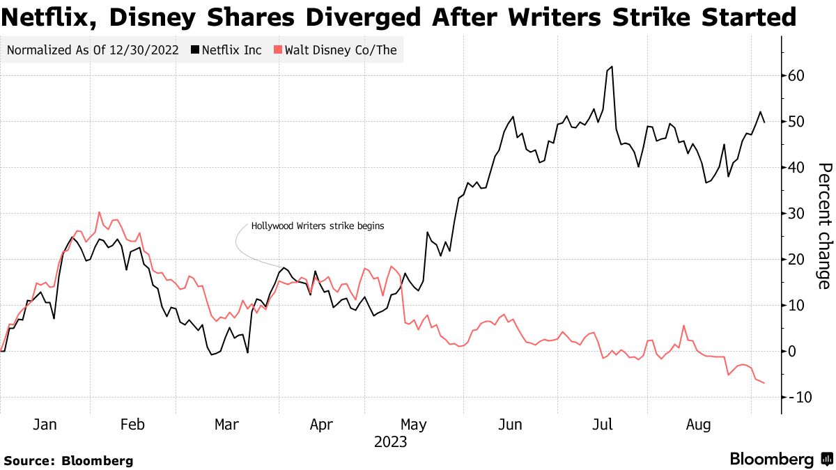 相比之下,Netflix股价今年已上涨了49% —— 现在大约以32倍的未来收益交易 —— 在盈利能力改善和流媒体订阅增长重新崛起的背景下,公司部分归功于打击密码共享。迪士尼在同一时期股价下跌了7.3%,正在计划类似的举措。