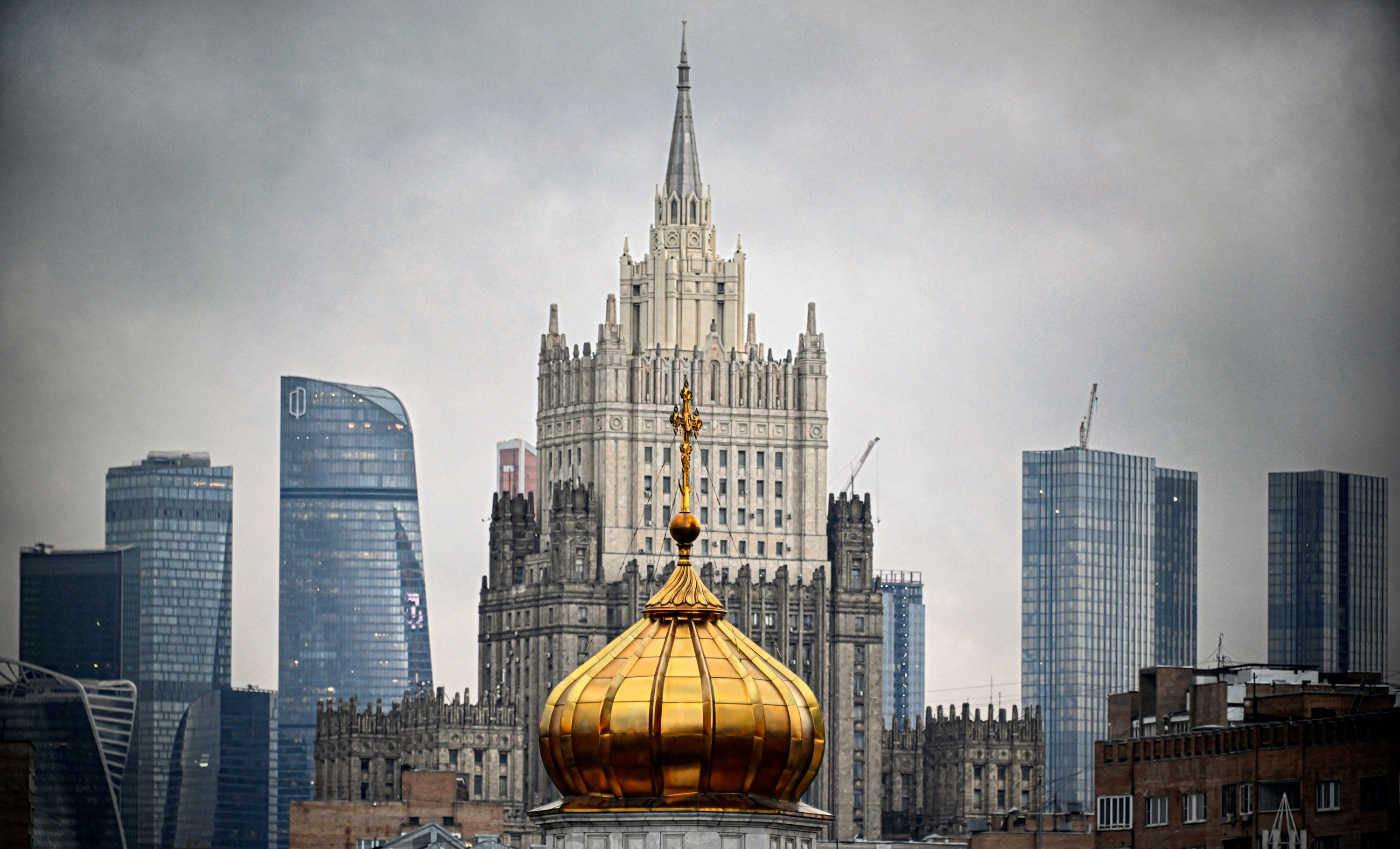 俄罗斯外交部大楼位于莫斯科的一座教堂圆顶后面。