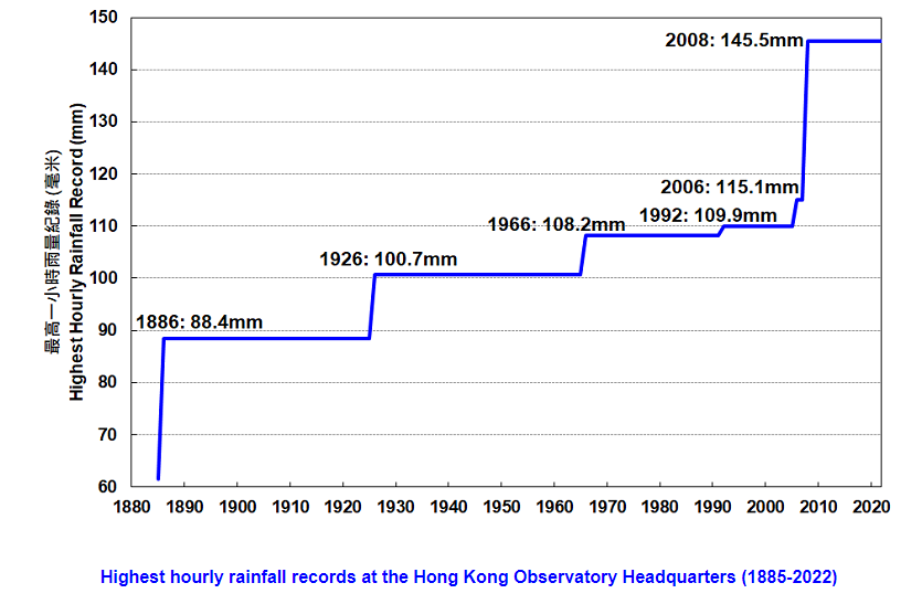 注:香港天文台总部的年降雨量(1884-2022)。1940年至1946年间没有数据,1900年的数据不完整。