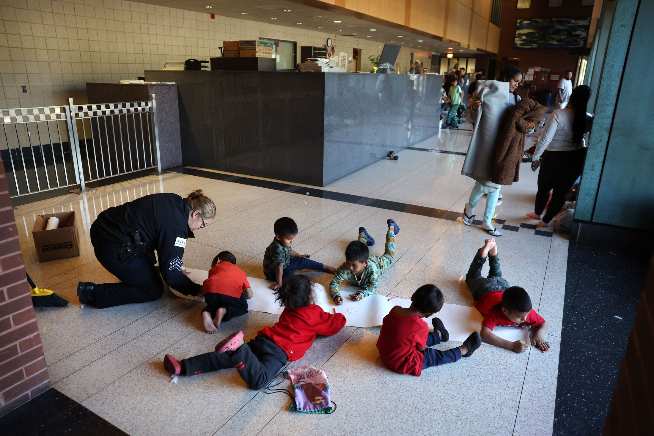芝加哥一名警察在5月4日,当移民家庭在警察局大厅避难时照顾儿童。摄影师:克里斯·斯韦达/盖蒂图片社在西部约1000英里(1600公里)的丹佛,迄今已有16,700名移民抵达,为他们提供住所和支持的费用已经超过2300万美元。七月上任的民主党市长迈克·约翰斯顿表示,市政府一直在帮助支付那些希望前往其他地方的人的公交车票。