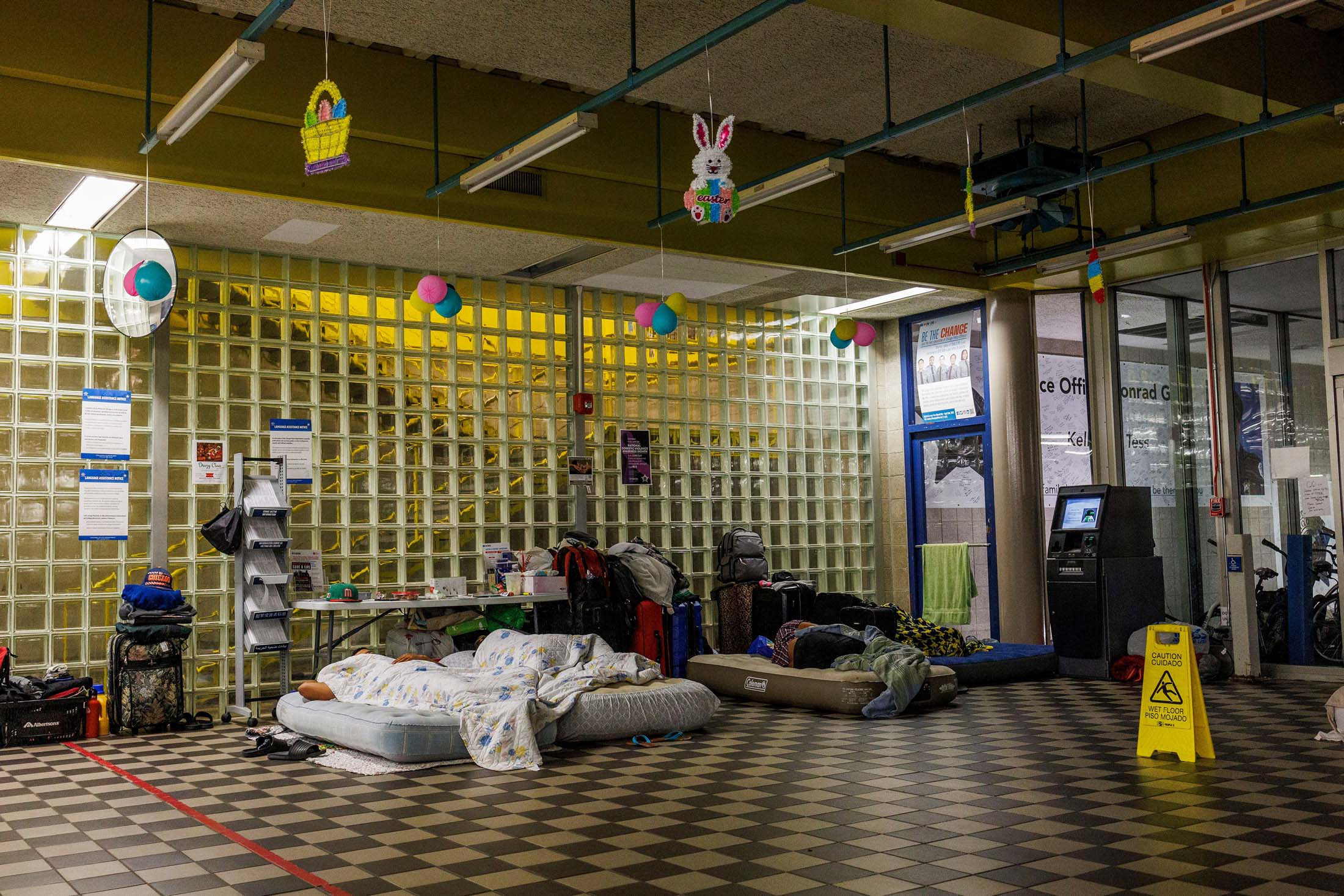 寻求庇护者在芝加哥一家警察局的大厅里睡觉,日期为6月22日。摄影师:阿曼多·L·桑切斯/盖蒂图片社2022年8月,在纽约市迎接第一批抵达的移民大巴时,市长埃里克·亚当斯(Eric Adams)伸出握手并送上食物盒,承诺官员们将“为这些家庭设定正确的基调”。